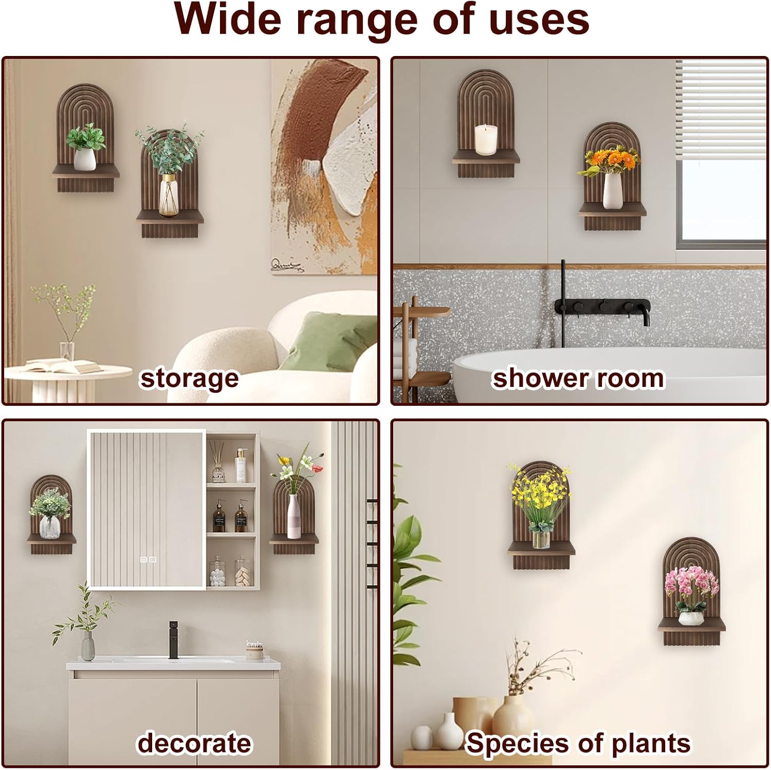 Specification parameters:our package includes 2 pieces of boho floating shelves, 2 hanging hooks for each shelf; This set allows for varied display arrangements and redefines your storage in a stylish manner, and you can share them with your family and friendsthe attractive arched and boho design of these boho wall shelves effortlessly blends with various themes and rooms; Be it in your living room, bedroom, office or dining area, these shelves enhance the ambiance while providing a practical storage solutionProduct size: 18*12*34.5CMNumber of pieces: 2Screws: 2 packsProduct list: Bohemian Wall Decoration *2