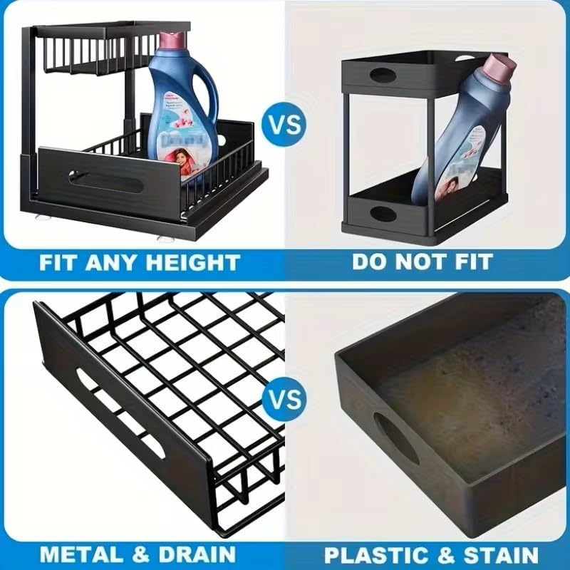 Product Description Maximize the storage potential of your under-sink cabinets with our 2-Tier Heavy-Duty Metal Under Sink Organizer. This pullout storage solution turns cluttered, hard-to-reach spaces into a well-organized area for all your cleaning supplies, toiletries, and pantry items. ✅ Heavy-Duty & Durable Construction Crafted from premium, rust-resistant metal, this organizer is built to withstand daily use. Its sturdy frame can hold up to 30 lbs of weight, ensuring your bottles, cans, and cleaning products stay securely in place without wobbling or bending. The sleek black finish also resists scratches and water damage, making it ideal for humid kitchen and bathroom environments. ✅ Slide-Out Design for Easy Access The lower shelf features a smooth pullout drawer that glides effortlessly, so you can reach items at the back of your cabinet without kneeling or rummaging. The upper open basket adds a second layer of storage, perfect for smaller items like sponges, brushes, or travel-sized toiletries. ✅ Tool-Free & Quick Assembly Set up your organizer in minutes with no tools required. Follow the 3-step illustrated instructions to snap the frame and shelves together in under 5 minutes. The compact, modular design also allows for disassembly if you need to store it away or move it to another cabinet. ✅ Multi-Scene Versatility This space-saving rack isn’t just for under the sink: Kitchen: Store dish soap, sponges, and trash bags Bathroom: Organize shampoo, conditioner, and cleaning sprays Pantry: Keep snacks, canned goods, and baking supplies tidy Closet: Use it for skincare products, hair tools, and accessories ✅ Sleek & Space-Saving Dimensions Measuring 14”L × 10.62”W × 11”H, this organizer fits most standard under-sink cabinets. The open-wire design prevents water buildup and makes wiping spills a breeze, keeping your storage area clean and hygienic. Package Includes: 1 × 2-Tier Under Sink Organizer 1 × User Manual