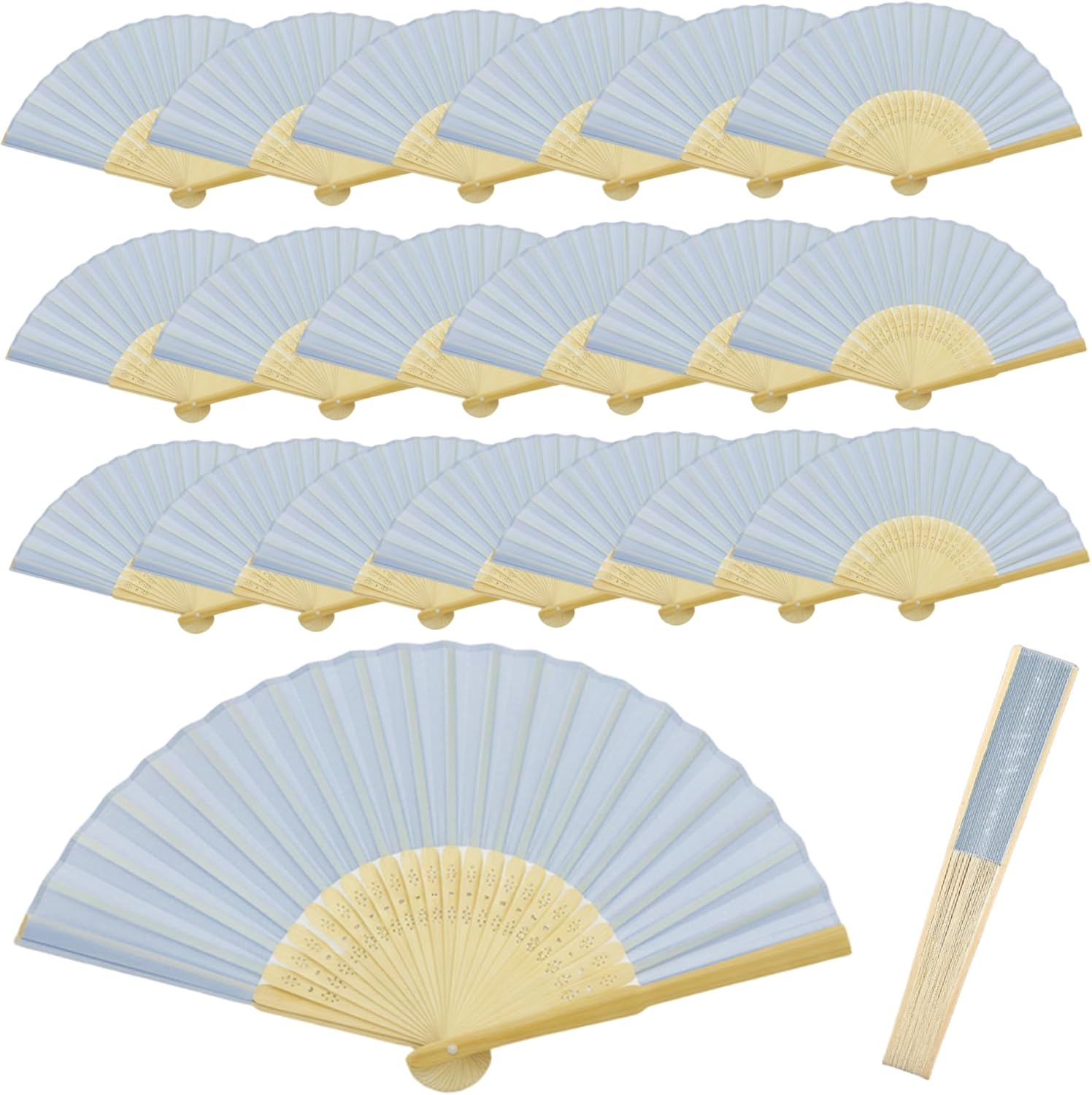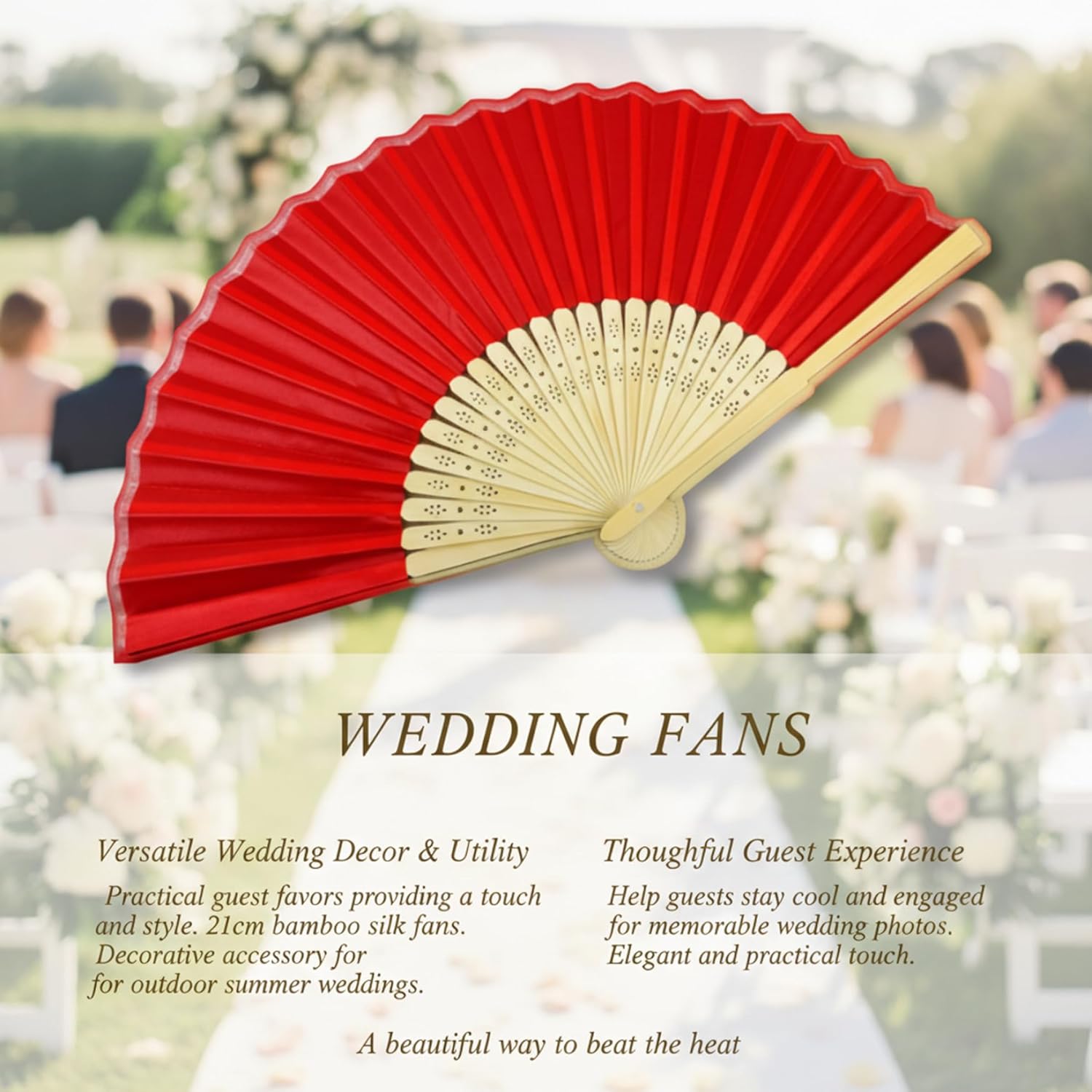 Description: Add a touch of elegance and practicality to your special day or home with this set of 50 Red Folding Fans. Expertly made from natural bamboo and smooth silk, each fan embodies a timeless, classic aesthetic. Perfect for welcoming guests at an outdoor wedding, these handheld fans provide a graceful way to stay cool. Their generous 15-inch diameter provides ample airflow, while the folded size makes them discreet and portable. We include 50 fans in one order, ensuring you have enough for your wedding party or event attendees. Except their functional use, these fans serve as beautiful decorative pieces. The soft red hue and traditional design make them versatile for enhancing a room's ambiance, creating a themed party display, or simply enjoying as a personal accessory. The bamboo frame provides a sturdy yet lightweight feel, and the folding mechanism is reliable for repeated use. Whether you're looking for thoughtful wedding favors for guests, unique decorations for a cultural celebration, or a charming addition to your living space, these silk bamboo folding fans provide both style and gentle utility. Features:. Folding Fan. -Color: Red. -Material: Bamboo. -Size: Fold 21cm/8.3inch. Unfold diameter 38cm/15.0inch. Note: Manual measurement, please allow slight errors on size. The colors may exist slight difference due to different screens. Package Including 50Pcs Folding Fan