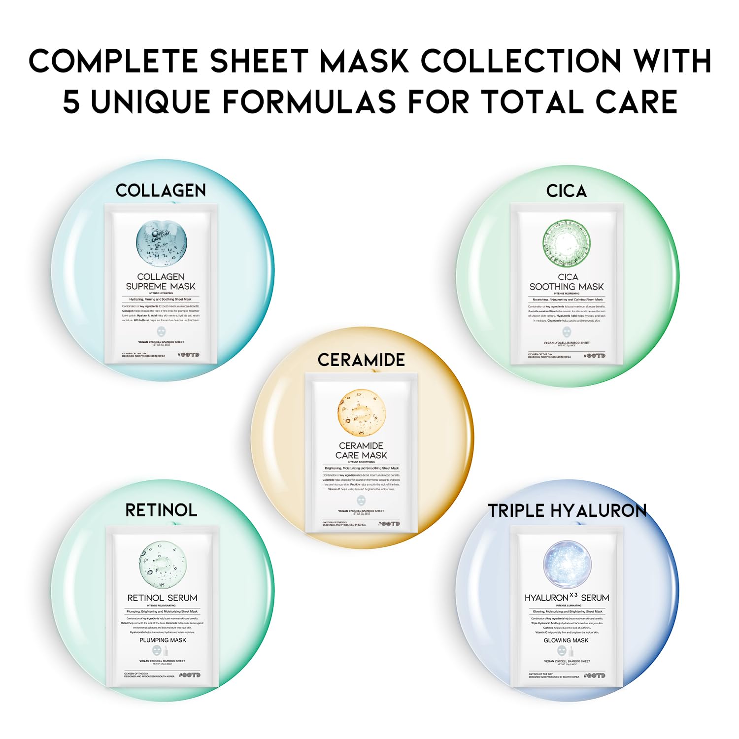 | Product Benefits | Korean face sheet mask bundle with hydrating, brightening, moisturizing, firming and soothing effect. Vegan certified with collagen, hyaluronic acid, ceramide, cica, peptide, retinol and vitamin C . |
