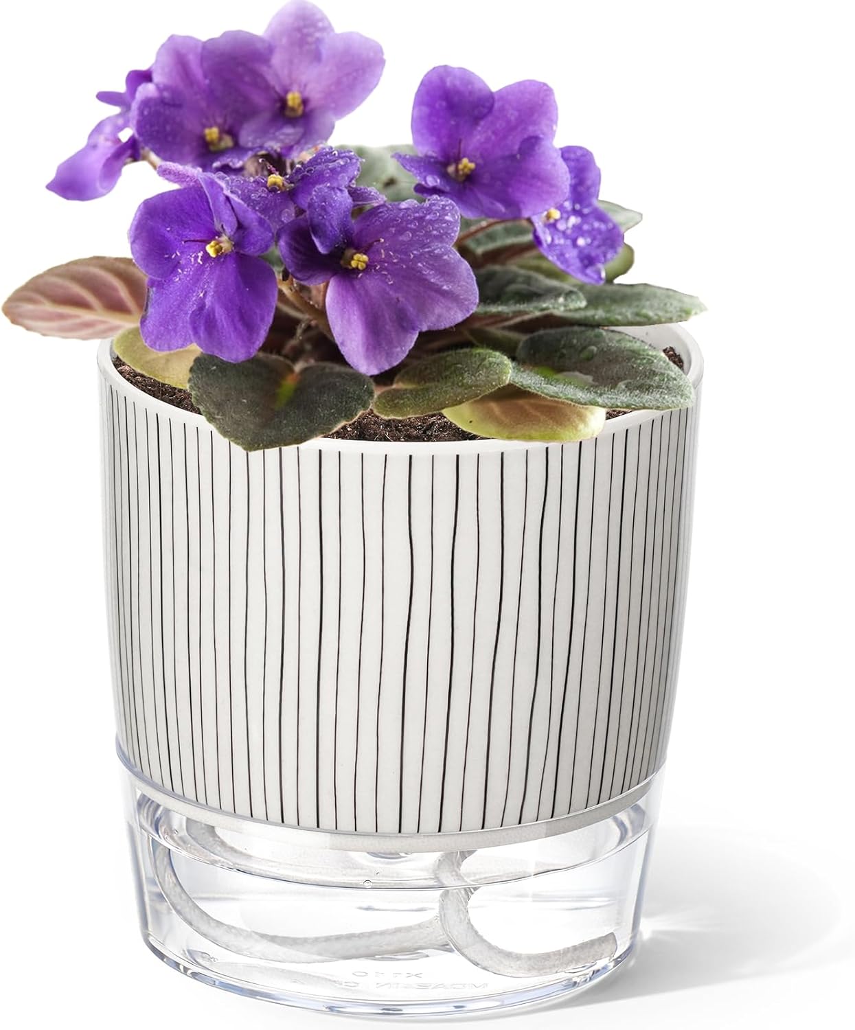 These self-watering plant pots combine functionality with modern style, making plant care easier than ever. The set includes planters in 4-inch, 5.5-inch, 6.3-inch sizes, perfect for orchids, succulents, African violets, and various indoor plants. The innovative self-watering system features a built-in water reservoir and white cotton rope wick that automatically delivers moisture to your plants for up to a week, reducing the need for frequent watering. Crafted from durable, lightweight plastic with a sleek black stripes design, these round planters feature clean lines and a smooth finish that complements any modern decor. The tabletop mounting style makes them ideal for windowsills, desks, and shelves throughout your home. Whether you're an experienced gardener or just starting out, these planters are incredibly user-friendly and easy to maintain. Simply wipe clean or rinse with water for hassle-free upkeep. The self-watering feature is particularly beneficial for busy individuals or those who travel frequently, ensuring your plants stay hydrated and healthy even when you're away. Please note that plants are not included with the pots.