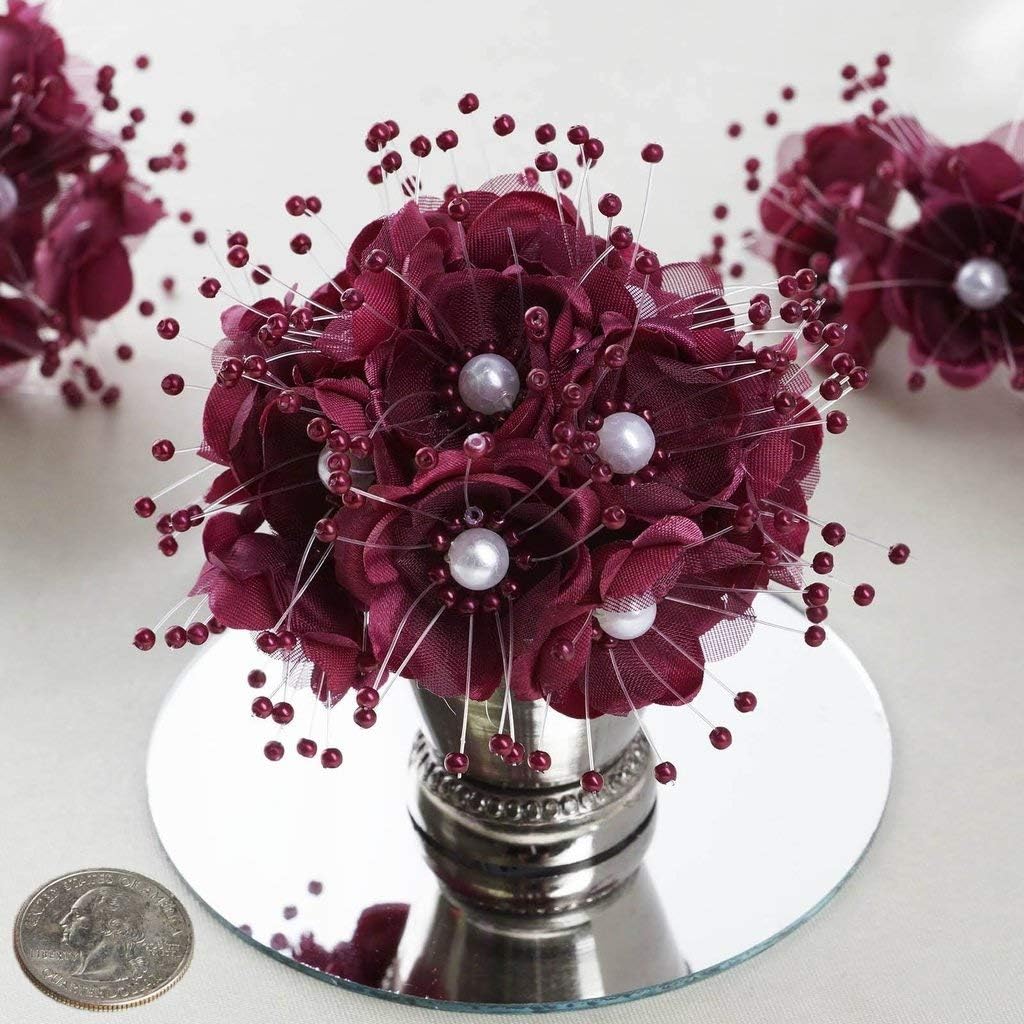 72 Satin Pearl Flowers (12 bunches of 6) 1.5" from tip to tip of each petal with a white pearl in the middle and pearl strand coming out of the middle Ideal for favors or any decorating for shower or wedding