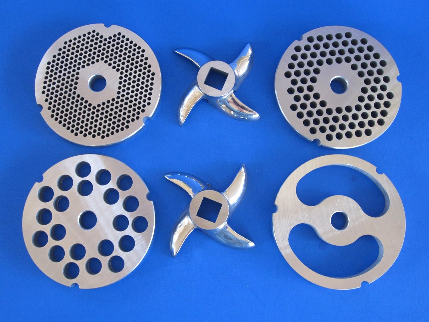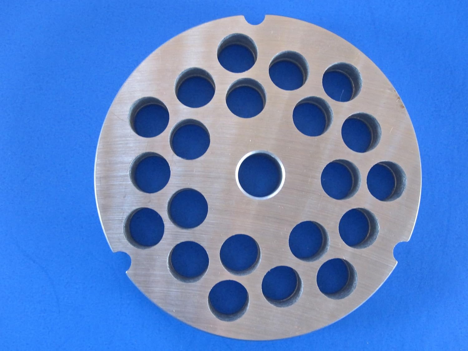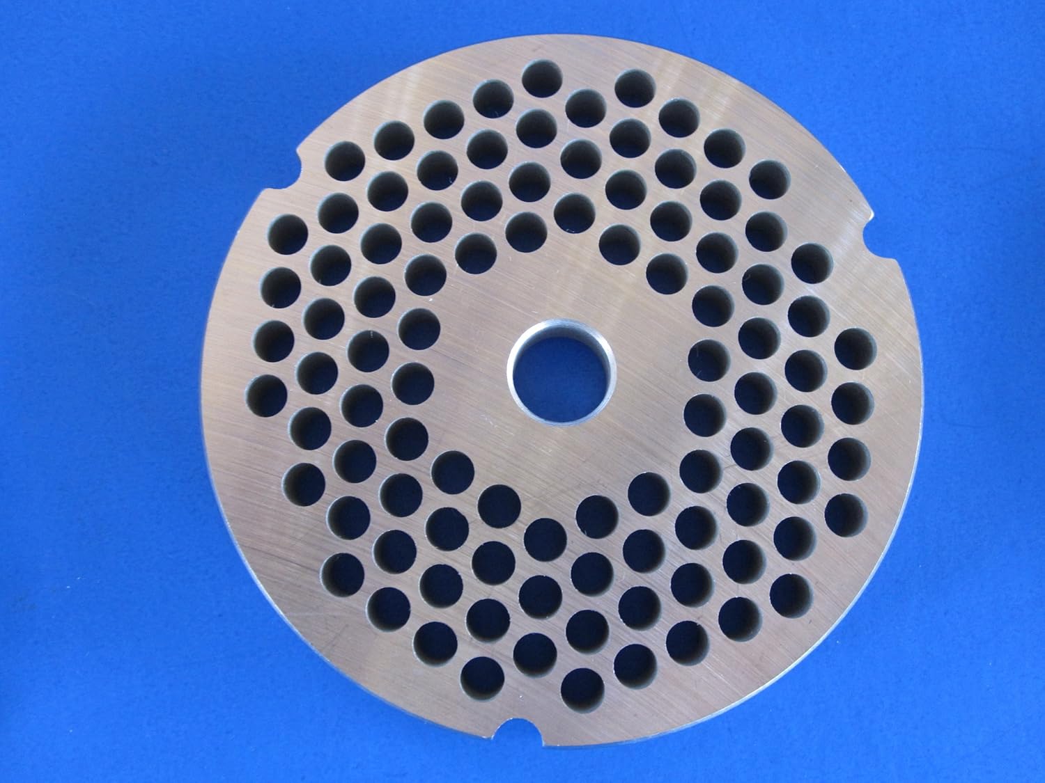 Size #32 replacement meat grinder stuffing plates, knives and (3) new stuffing tubes. Stainless steel. Will not rust. Fits all common brands of electric or manual meat grinders that have round plates that are 3 15/16" in diameter. This 9-pc set has 3 stainless steel tubes. 4 plates in the 1/8" fine grind, 1/4" burger grind, 1/2" course grind and the 2-hole stuffing plate. Use the stuffing plate in your meat grinder when stuffing sausage into the stuffing tubes. Plate holes in metric are 3mm, 4.5mm and 12mm Plates are 7/16" (9.3 mm) thick