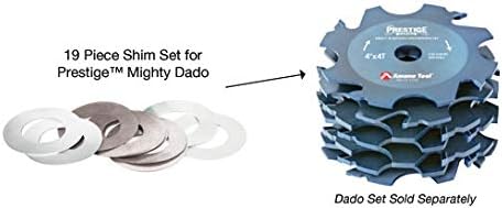 The perfect accessory for the above dado/groover set. Each set includes 19 shims in various thicknesses for precise adjustments of your dado/groover set width. Especially useful when working with plywood and other materials that are slightly under or oversized, #67254, Description: 19 pc. Shim set, 67254 19-piece shim set for 3/4 Bore prestige mighty dados