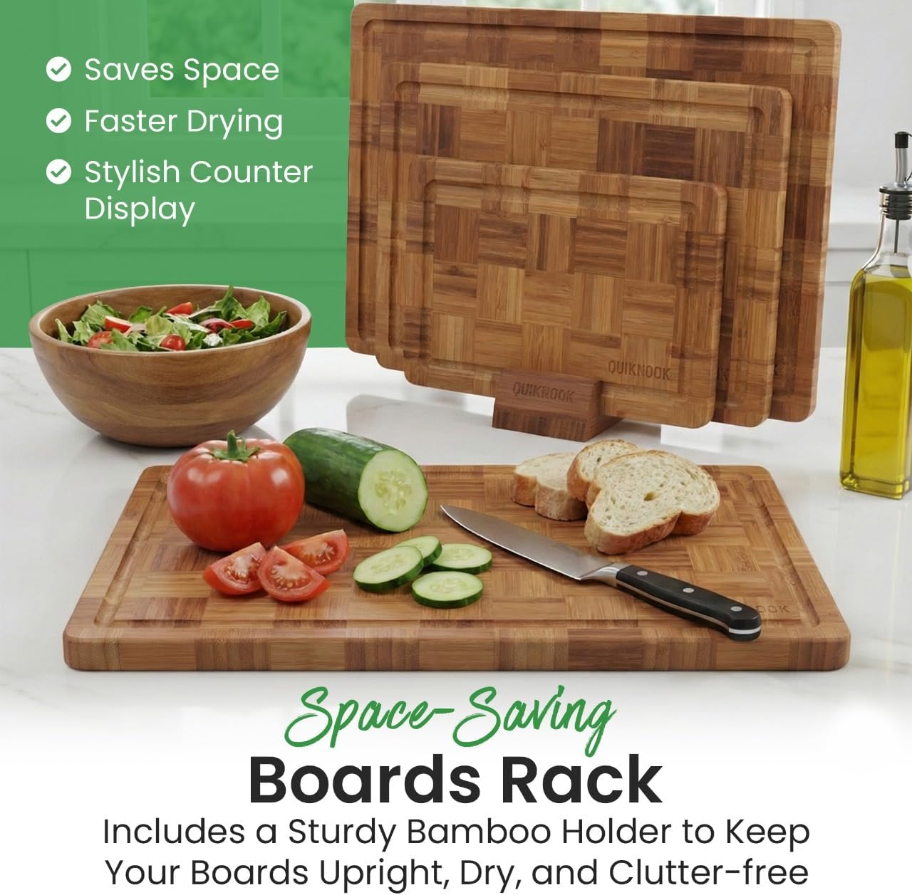 Bamboo Cutting Board Set of 3 with Stand Why Single-Layer Bamboo Wins Crafted from a solid piece of natural bamboo instead of multiple bonded layers, these boards provide dependable support for everyday kitchen tasks. Built for Everyday Prep The thick bamboo construction is suitable for slicing, chopping, and dicing a variety of ingredients. Cleaner Countertops, Smoother Cooking A built-in juice groove helps catch excess liquids from meats, fruits, and vegetables to keep your workspace tidy. Designed for Organized Kitchens This 3-piece set includes large, medium, and small boards with a convenient holder for upright storage.