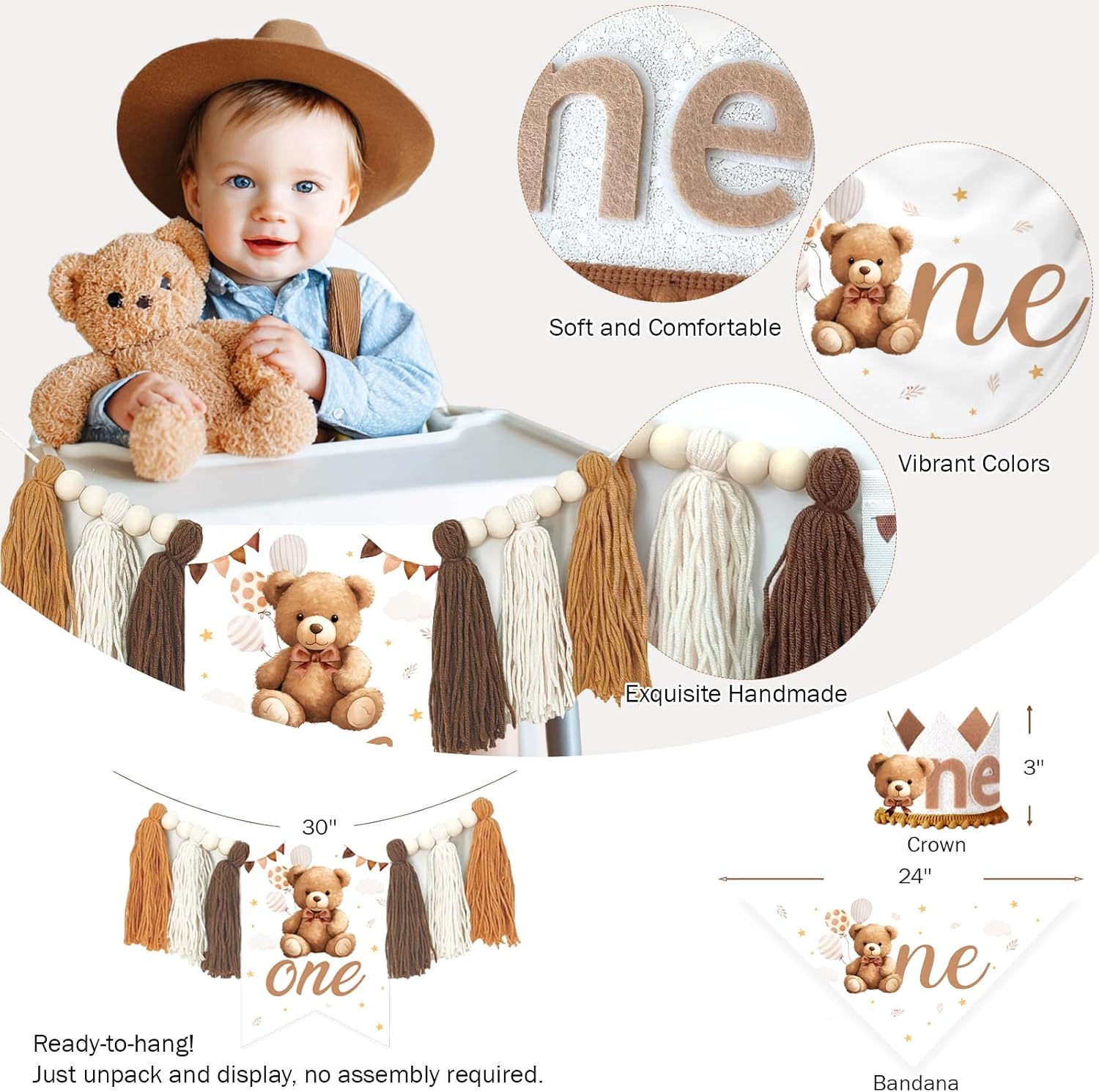 | Included Components | Bear & Number 1 Foil Balloon, Boxes, Beary First Birthday Backdrop, Poster, Beary First Birthday Decorations, Brown & Apricot & Ivory Balloon Garland, Highchair & Photo Banner, Cake Topper |