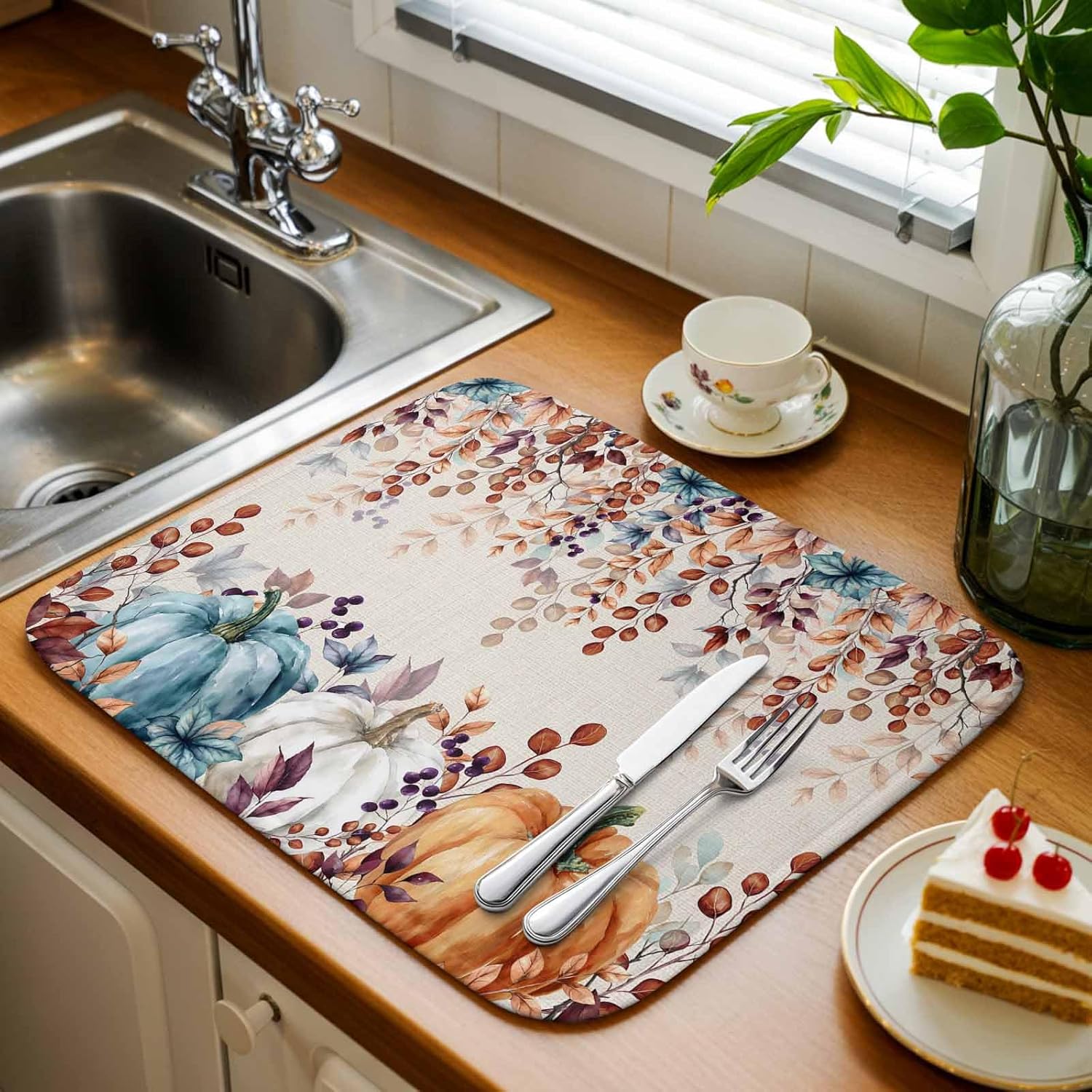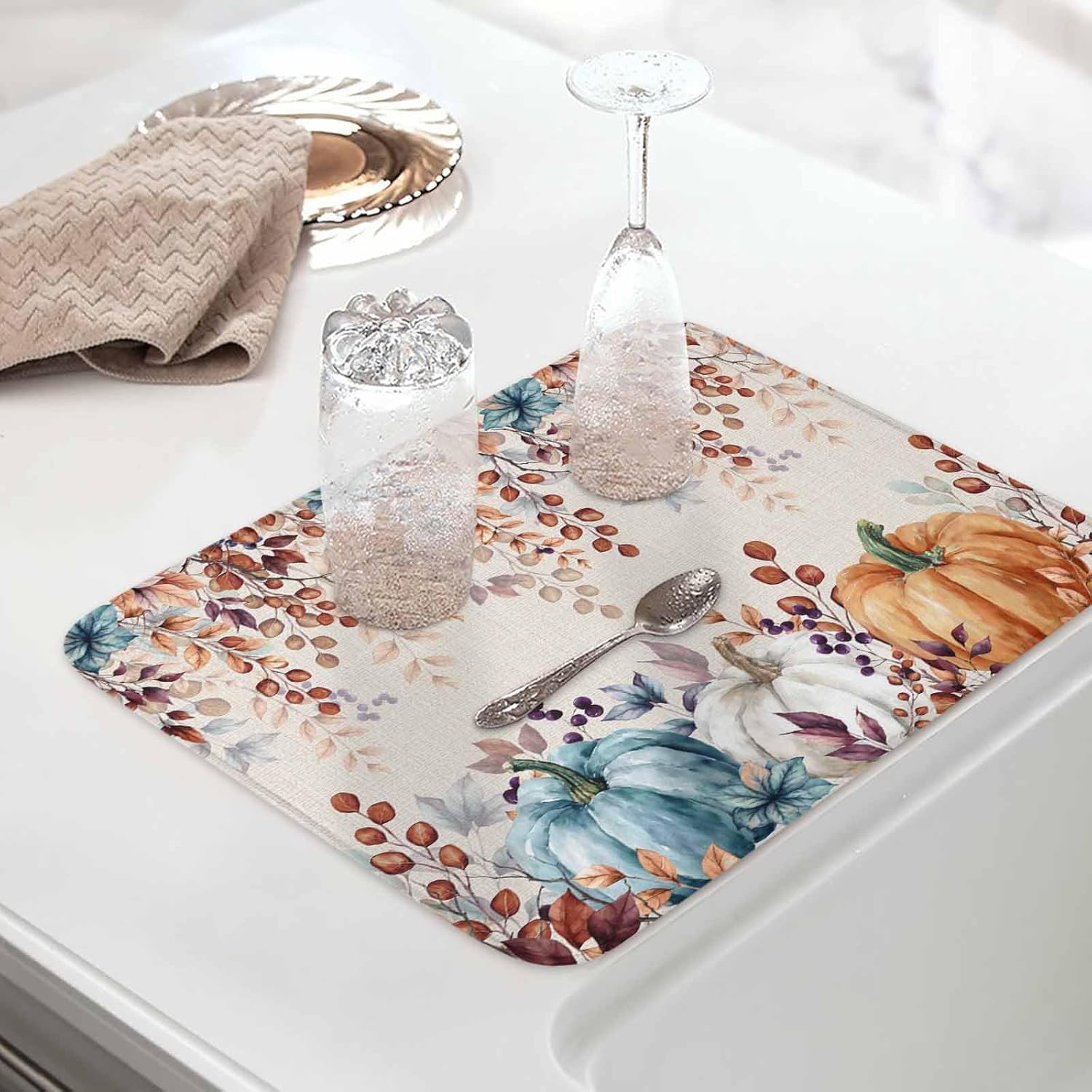 Maybe you wash most of your items in the dishwasher, but some crystal vases, glasses, and delicate items, as well as pots and pans and other items that don't fit in the dishwasher, need to be hand washed.A soft dish drying mat is a good option for handwashing.♫High Quality Thanksgiving Drying Mat- The surface of the drying mat for kitchen counter is composed of soft microfiber material.- Fall dish mat with elastic sponge interlayer, high water absorption.- The bottom of the dish mats for counter is made of natural rubber, which is environmentally friendly and non-slip.♫Thanksgiving Drying Mat For Kitchen CounterDish mat drying kitchen mat placed on the countertop quickly absorbs water splashes while washing dishes at the sink, avoid water spots from running into the cabinets.♫Drying Mat For TableThanksgiving dry mat for dishes can be used as placemats to isolate high-temperature food and avoid tableware from scratching the tabletop to protect the integrity of the tabletop.♫Dog Dish MatRustic dish drying pad can also be used as pet utensils pads to avoid stains from seeping into the ground after pets overturn the food while eating, reducing the time for housework.♫Mouse PadPortable dish drying mat works great with the mouse, absorbs drips from a frosty drink, cushions your arm against the hard table top, and has plenty of space left over for a notepad and pencil jar.♫Coffee Maker MatThanksgiving dish mat drying quickly capture coffee splatter and protect expensive kitchen countertops and other interior surfaces from coffee splatter or coffee bean stains.♫Great Gift IdeaFarmhouse dish drying mat is the best gift for family and friends because of its stylish design and strong water absorption, suitable for housewarming, birthday parties, weddings, Thanksgiving, etc.
