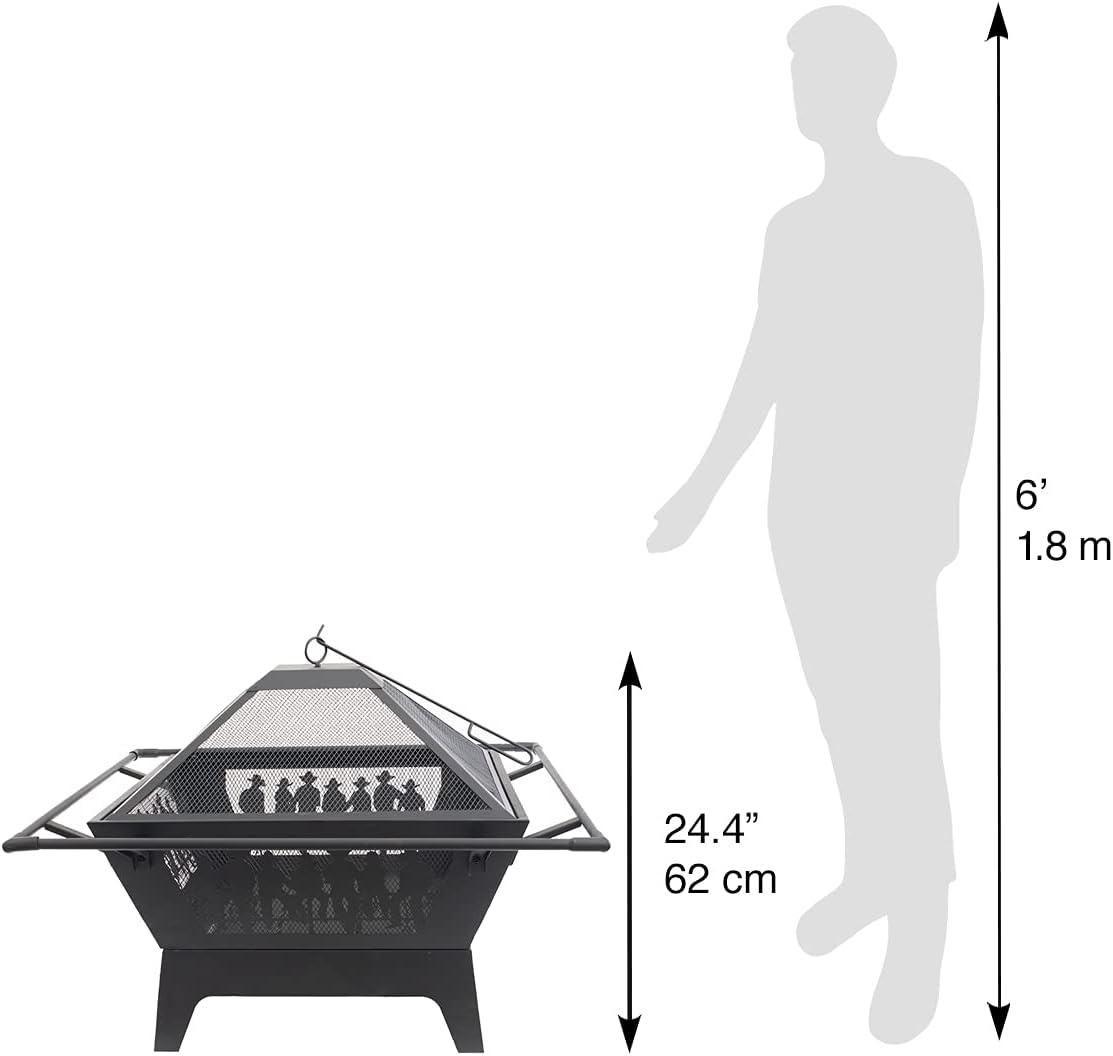 Amplify your next outdoor adventure while keeping warm and cozy with the Blue Sky Outdoor Living 31” Square Cowboy Fire Pit. This portable fire pit offers a convenient and efficient way to enjoy a fire in your backyard patio or during all of your outdoor excursions such as beach days or camping trips. Designed with mesh panels featuring decorative cutouts, the fire pit provides a full 360-degree view of the fire while making for a stylish addition to any backyard. It allows for larger logs and features welded-in air circulation channels for a sufficient air flow to improve the burn of the fire. The spark screen keeps embers and sparks safely contained so you can enjoy your time by the fire worry-free, and a screen lift and ash catch are also included for additional convenience. Constructed from heavy-duty steel with a high temperature black paint finish, this backyard fire pit provides long-lasting durability that can withstand tough use outdoors.