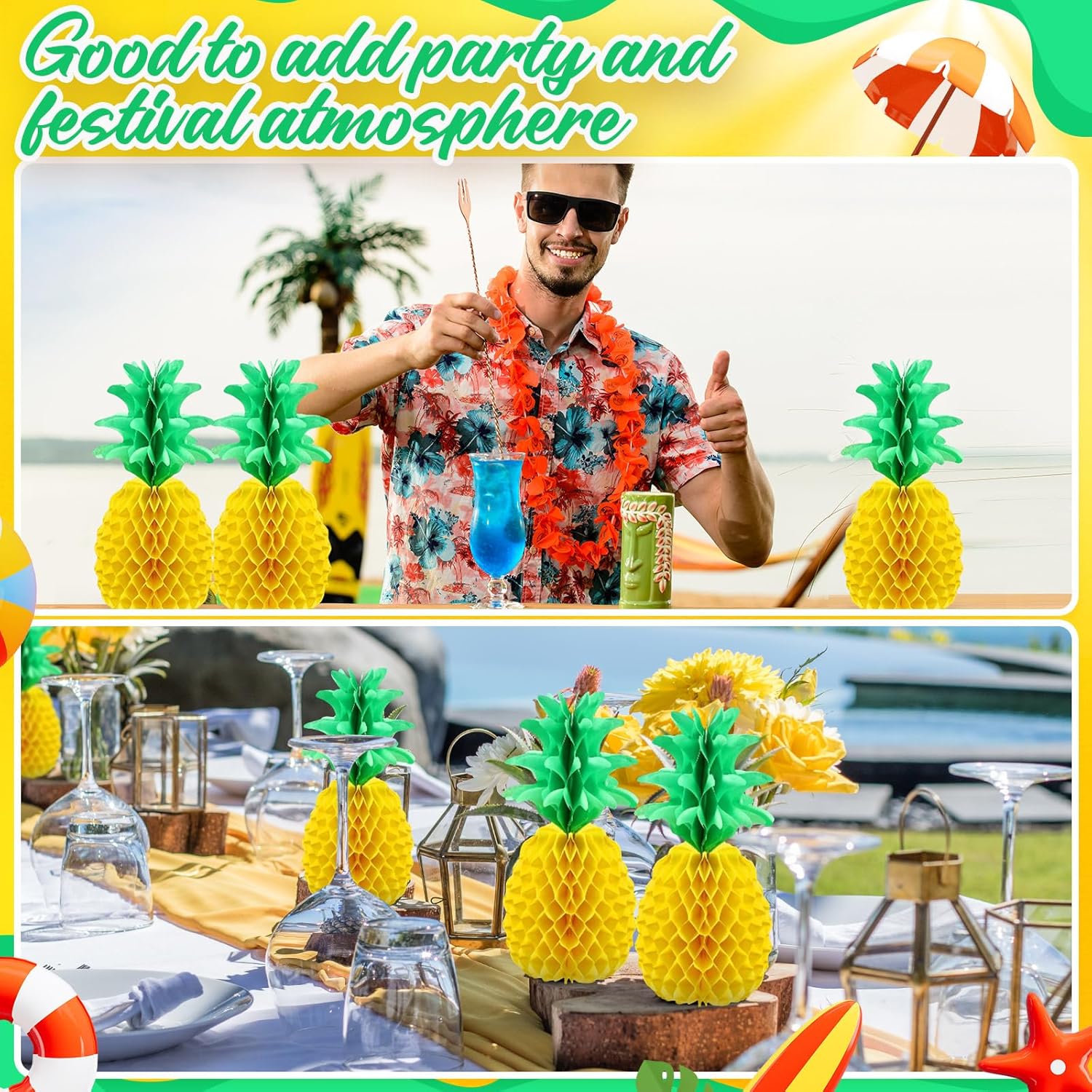 Feature: Easy to use: With a rope hanger, you can hang and remove easily, the pineapple honeycomb can be hung indoors such as chandeliers, wall hooks, cabinets, or hanging outdoors, such as sun umbrellas, trees and so on, adding party atmosphere. Multi-functional: Pineapples can be opened and stored for their compact size, you can apply these wonderful decorations easily, just put multiple pineapples together to make a festive garland, or cluster them together as a three-dimensional backdrop. Wide applications: Tissue pineapples are very cute, they fit for creating a special atmosphere and add charm to the house, and these Hawaiian pineapples can be applied as ornaments for summer party, pineapple themed party, Hawaiian party, luau party or other tropical-themed parties. Specifications: Material: tissue paper Color: green and yellow Package includes: 20 x Pineapple honeycomb