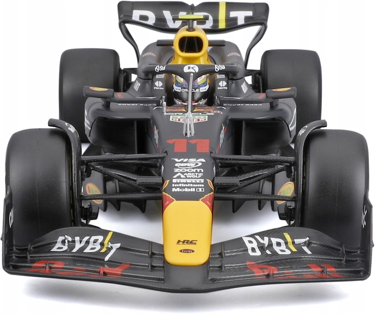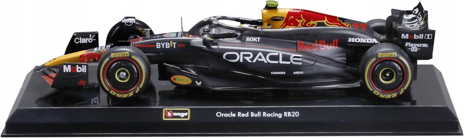 Oracle Red Bull Racing RB20 (2024) #11 Sergio Perez Original Bburago Officially licensed vehicle design. Metal model with plastic parts. Perfect detail reproduction Model placed on a plastic base and enclosed in a protective display case. Length of bolid: approx. 23 cm Package size: 26 * 12 * 9 cm / 10.2RB20 is a bolid of the Oracle Red Bull Racing team that competed in the 2024 Formula 1 season. Designed by Adrian Newey and his team, it was an evolution of the dominant RB19 with numerous aerodynamic and mechanical improvements. Powered by the Red Bull Powertrains unit in collaboration with Honda, the RB20 offered excellent performance and cornering stability, making it one of the season's favorites. The key element was an advanced suspension and a modified base that maximises the surface effect.