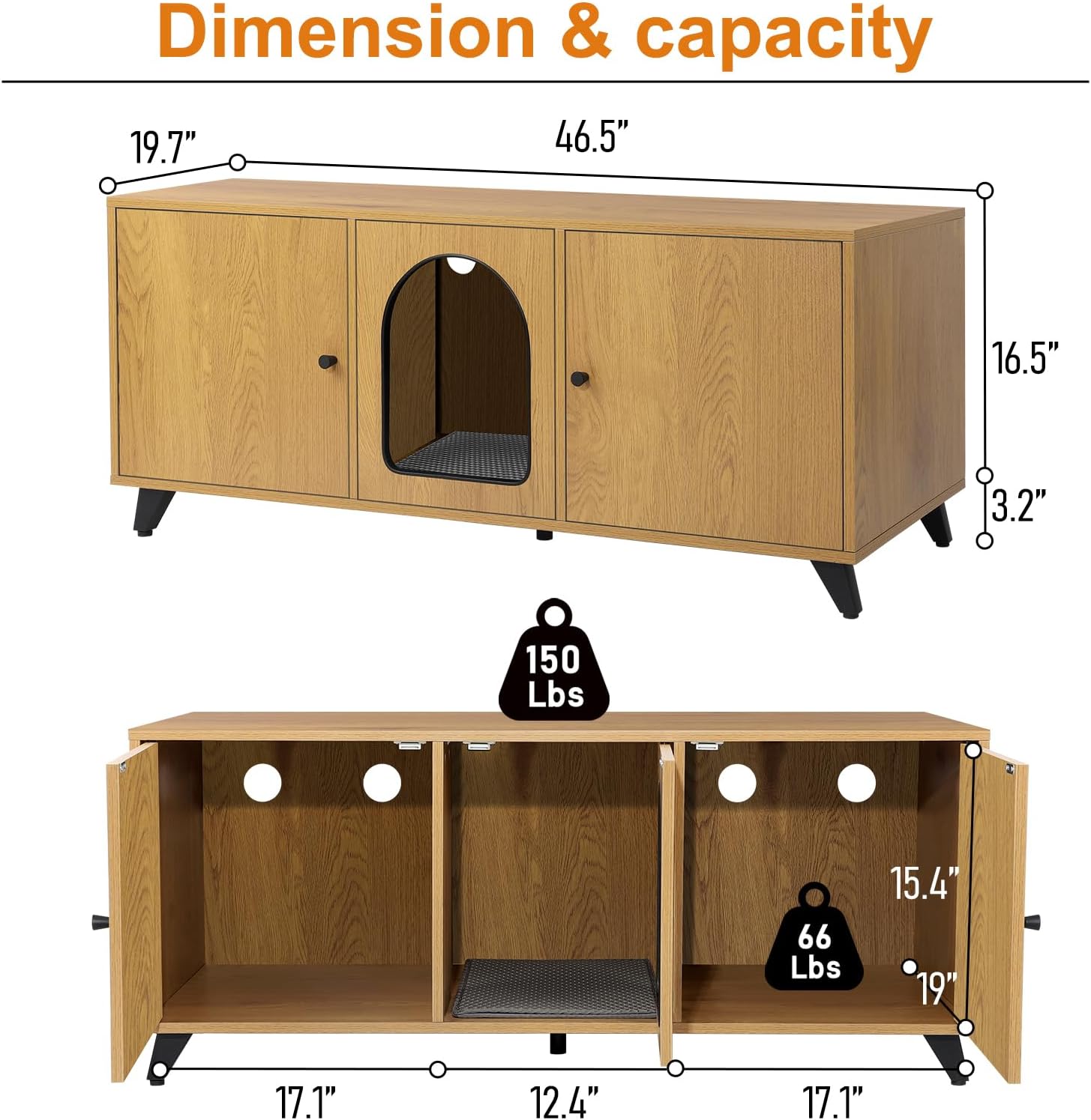 Description: Transform your home with the Modern Cat Litter Box Enclosure for 2 Cats, a stylish and functional solution designed to keep your living space clean, odor-free, and organized. This Hidden Litter Box Furniture features a dual-room design, providing each cat with its own private space for comfort and hygiene. The enclosure comes with a two-layers cat litter mat to trap loose litter to absorb accidents, ensuring minimal tracking and superior odor control. Its sleek, contemporary design seamlessly blends into your home decor, disguising the litter box as an elegant piece of furniture. Measuring 46.5" W x 19.7" D x 19.7"H, this Hidden Litter Box Furniture offers plenty of room for your cats to move around comfortably while keeping litter neatly contained. The wide tabletop adds functionality, providing a perfect space to display decorative items, plants, or other household essentials. Cleaning is a breeze thanks to the removable trays, and the durable construction ensures long-lasting performance. Perfect for pet owners who value both style and functionality, the Modern Cat Litter Box Enclosure combines practicality with elegance. Keep your home clean, fresh, and stylish while providing your feline friends with a comfortable and private space they’ll love!