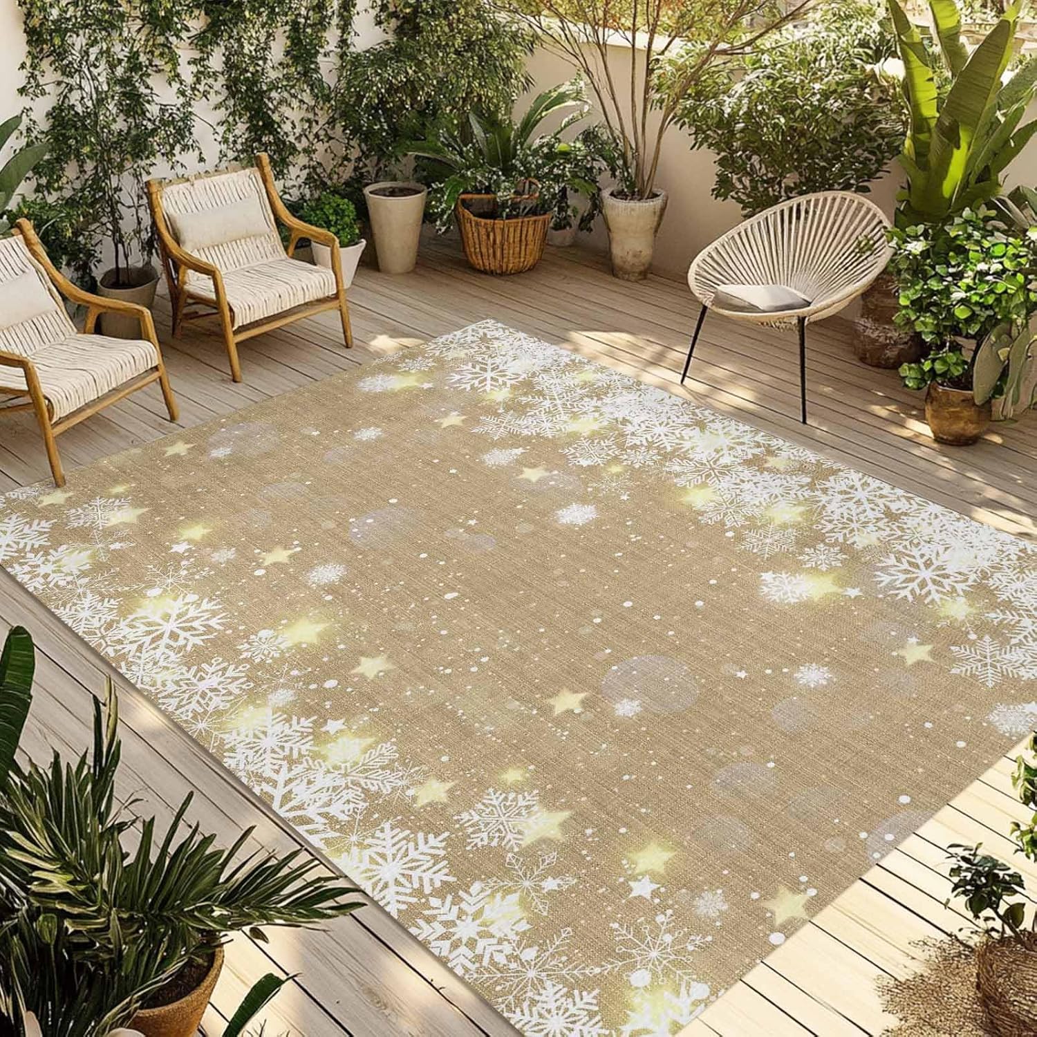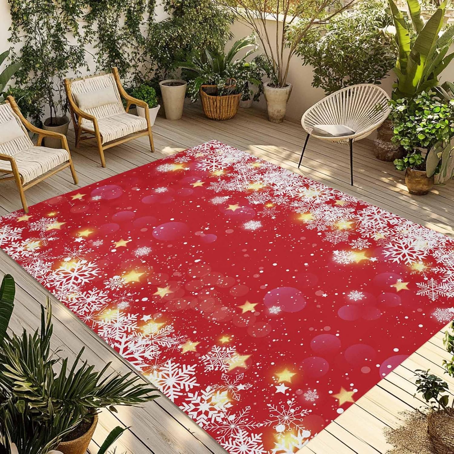 Enjoy supreme comfort and plush softness under your feet.Transform your existing decor with the chic modern style of our outdoor area rug carpet.Size4x6 ft5x8ft 6x9ftThickness measures: 0.2 in.Shape: RectangularBacking: Non-skip rubber points.Package includes:1 PC x Area RugsSpecial Note: Rugs may contain temporary creases upon arrival, allow time for creases to flatten and settle.How to remove carpet creases? 1. Wet the carpet and flatten it to air dry 2. Use a steam iron 3. Roll the area rug in reverse of the wrinkle or crease 4. Use a steam cleanerPremium MaterialMade from high-quality, soft, comfortable and strong durability. Provide a warmer and softer feel under your bare feet and knees, without damaging your deck or grass.Double-layer, outdoor mat is breathable, easy to clean, washable and quick dry.Multiple OccasionOutdoor rugs suitable for terrace, balcony, deck, garden, beach, porch, RV, camping, garage and other places.Versatile Mats Outdoor PatioThe outdoor rug can fit your patio style well, elegant as it is functional, not only protects the floor, but also adds a new view and to show off your personal style.Ideal Home DecorThe soft outdoor carpet is available in multiple colors and sizes to suit your different styles and needs, making it an ideal choice for home decoration.Wash TipsWhen the rug is dusty, only need to wash it with a hose outdoors.