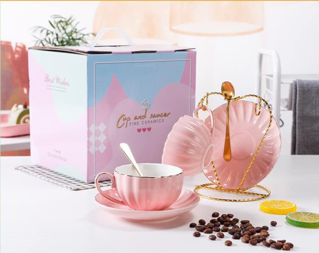 Bring Some Subtle Sophistication to Your KitchenElegant, Dense and Durable PorcelainCraft from durable ceramic, the Coffee Cup and saucer set is finished with an appealing glaze and fired at a higher temperature for superior chip and stain resistance, which ensures the end-user can enjoy the best possible coffee period.Chip-resistant for easy maintenance, and safe for microwave, dishwasher and freezer for your convenience.Color:Pink/Blue/WhiteCapacity:7 oz,Dimension:Cup size:9.5x5.5cm/3.8x2.2in(Diameter x H), Saucer size: 14.5cm/5.7in(Diameter x H).Spoon: 12.5cm/5inTop quality material fired at high temperature. Dishware Safe, BUT NOT for Microwave!What you get :2xCup2x Spoon2xSaucer 1× cup holderin a beautiful GIFT BOX.