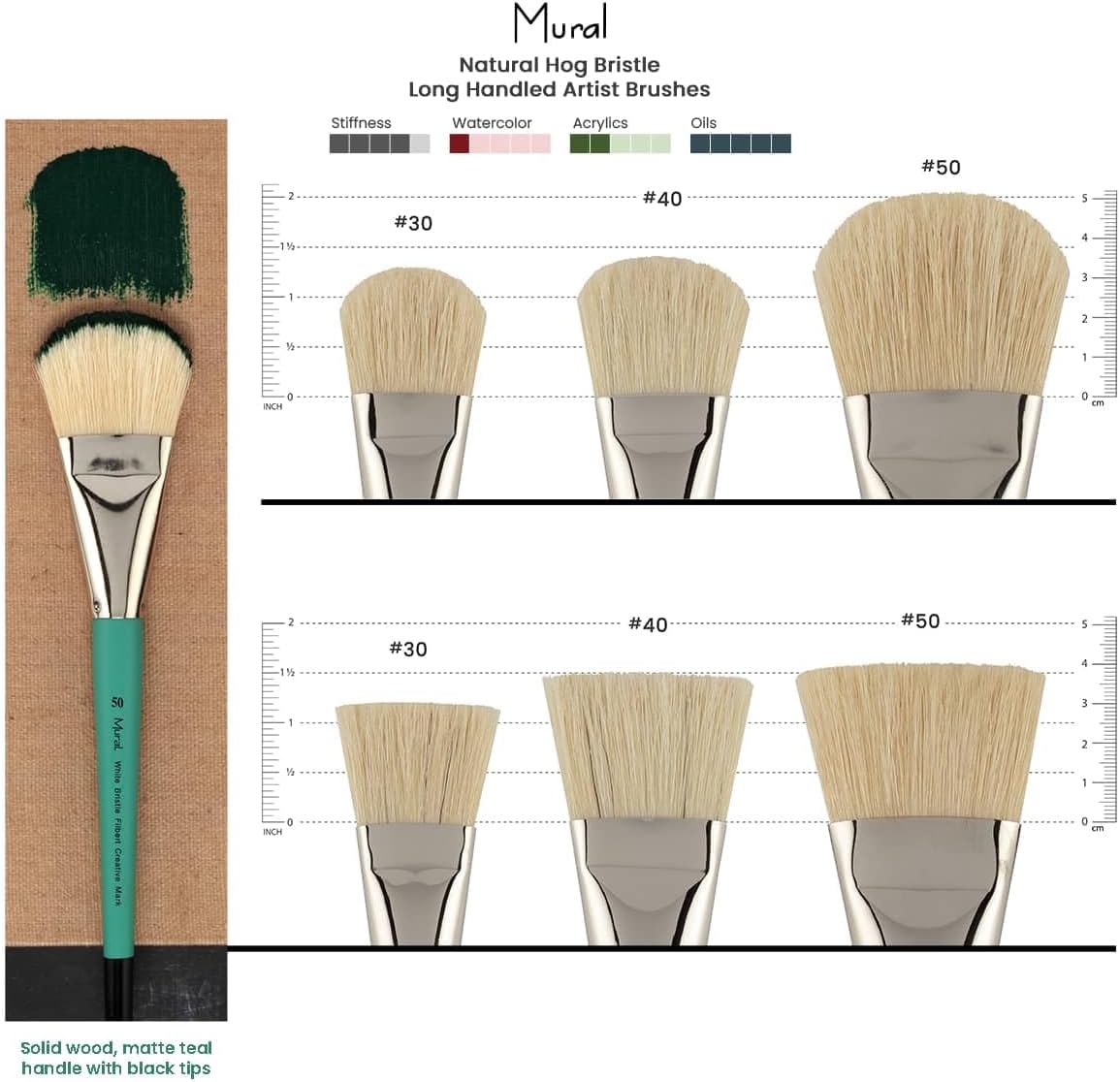 Introducing the Creative Mark Mural Large Brush Natural Hog Bristle Brushes, a quintessential tool for artists and muralists who understand that size truly matters. Expertly designed by Michi Toscano, this large brush caters to the needs of those engaging in large scale painting projects, providing an exceptional experience for both professional and emerging artists alike. Whether you are creating expansive abstracts or detailed murals, this tool is especially tailored to suit your artistic endeavors. The brush features seamless nickel-plated ferrules, ensuring durability and resilience, while the solid wood handle offers both comfort and control, making it an ideal choice for artists who require precision alongside comfort. The natural hog bristle is perfect for delivering broad strokes, making it an outstanding large paint brush for those working with acrylics and watercolors. Its versatility extends to traditional and water mixable oils, presenting a reliable option for a variety of mediums. This brush is a testament to the commitment to quality and functionality, offering artists an unparalleled tool in their creative arsenal. The Creative Mark Mural Large Brush Natural Hog Bristle Brushes is a must-have in your art supply kit, ensuring that when you require precision and breadth, this broad paint brush stands ready to meet your artistic needs. Enhance your art supplies with this essential piece from Creative Mark, and enjoy the confidence that comes from using a product designed for excellence in large scale artistic projects. Mural Flats and Filberts Sizing: Size 30 = 1 3/8"; Size 40 = 1 5/8"; Size 50 = 1 15/16". Mural Rounds Sizing: Size 30 = 9/16"; Size 40 = 3/4"; Size 50 = 15/16".