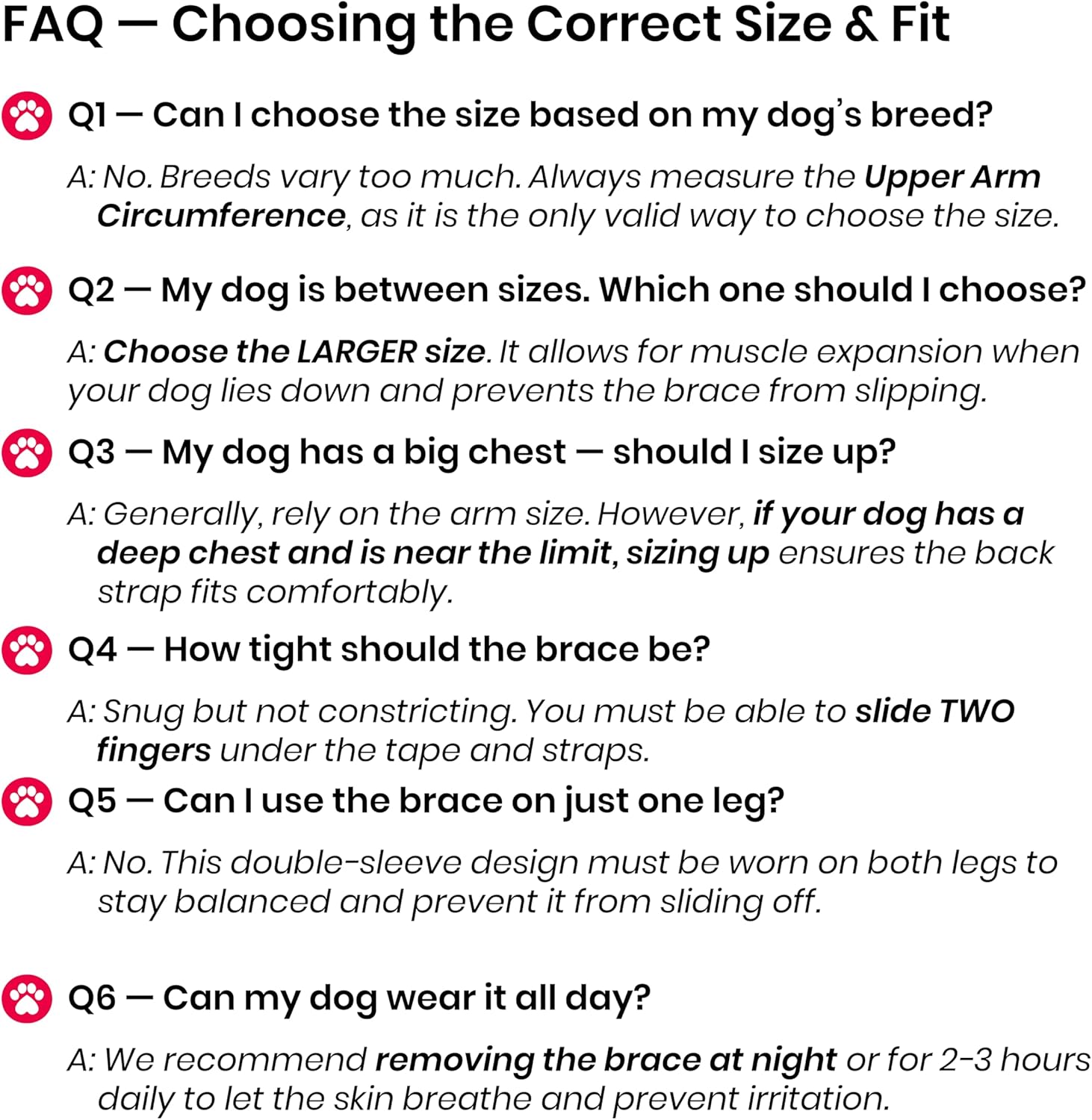 | Directions | Cleaning and Maintenance: Hand wash with mild soap and air dry to maintain the brace's quality and hygiene. Avoid machine washing or using harsh chemicals., Monitoring Usage: Start with shorter wear times and gradually increase as your dog adjusts. Remove the brace periodically to check for irritation or discomfort., Positioning: Align the brace to cover the elbow or front leg for optimal support and protection against calluses or hygroma., Proper Fitting: Secure the dog elbow brace around the elbow or shoulder with adjustable straps for a snug, comfortable fit without restricting movement., Veterinary Guidance: Consult your veterinarian for proper usage, especially if your dog has a serious injury, chronic condition, or post-surgical care requirements. |