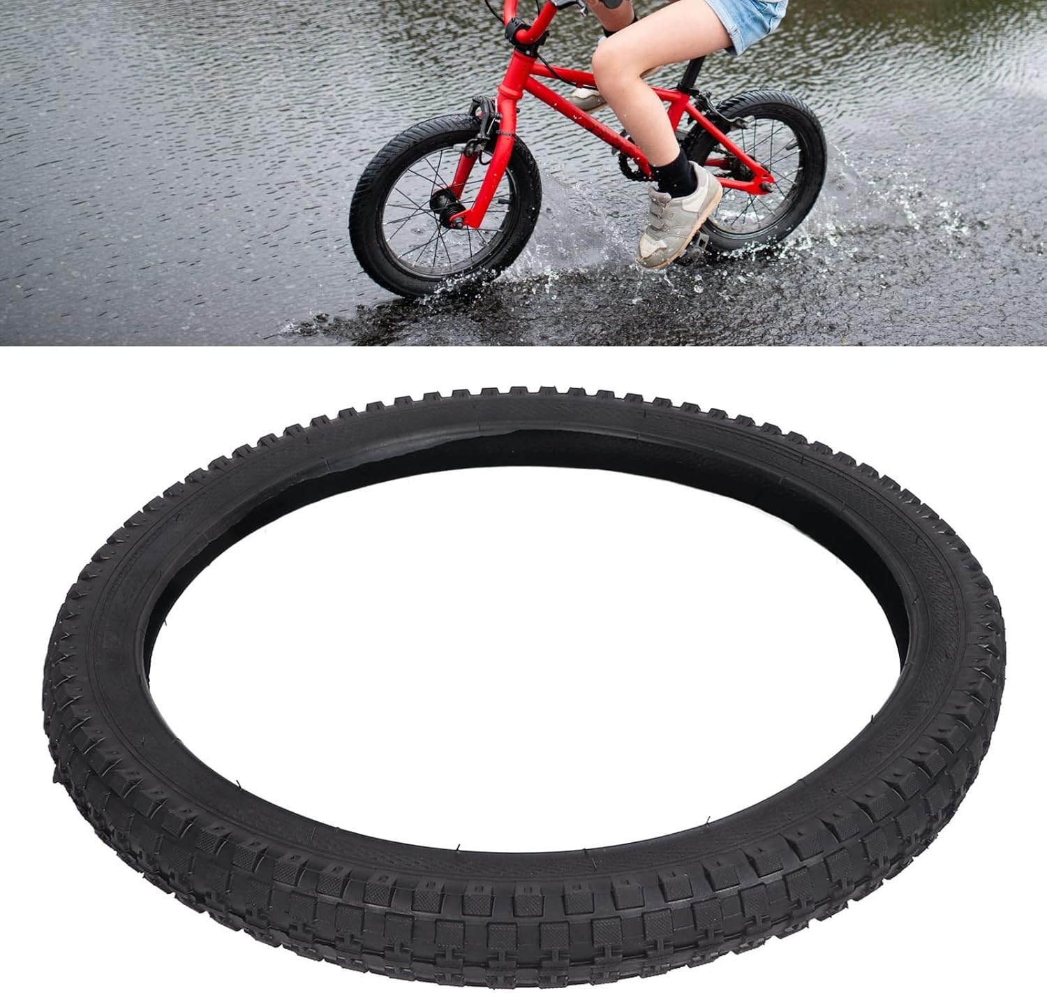 FASHIONABLE AND WEAR RESIST: Designed with a square pattern and thickened rubber appearance, this tire is both fashionable and highly sturdy. the increased proportion of natural rubber makes it lighter and even more wear resistant, great for active kids. EASY TO INSTALL AND USE: This outer tire is simple to operate, easy to install, and disassemble. even first-time users will find it straightforward to handle, ensuring a easy experience with no difficult requirements. COMFORTABLE DRIVING EXPERIENCE: With a tire pressure of 40 p.s.i and a maximum air pressure of 280kpa, this tire provides excellent damping. it allows for a smooth and comfortable ride on most road surfaces, enhancing the overall cycling experience. STURDY AND PUNCTURE RESIST: The outer tire features a special tread and high-strength body structure, offering exceptional puncture resistance and wear resist. this ensures a longer service life, making it a great choice for young cyclists. IMPORTANT SAFETY NOTE: While this tire is designed for durability, it is important to remember that any tire can be punctured by objects. always pay attention to road conditions and protections the tire to maintain its performance and longevity. Specification: Item Type: Children Bicycle Outer Tire Product Color: Black Style: Square Pattern Material: Natural Rubber Tire Pressure: 40 P.S.I Maximum Air Pressure: 280KPa Package List: 1 x Outer Tire How To Use: How to know the tire model? For example, the size marked on the side of the outer tire is 12x2.4 12 refers to the tire diameter of 12 inches 2.4 is tire width 2.4 inches It is recommended to use 12x2.4 inner tube, and so on