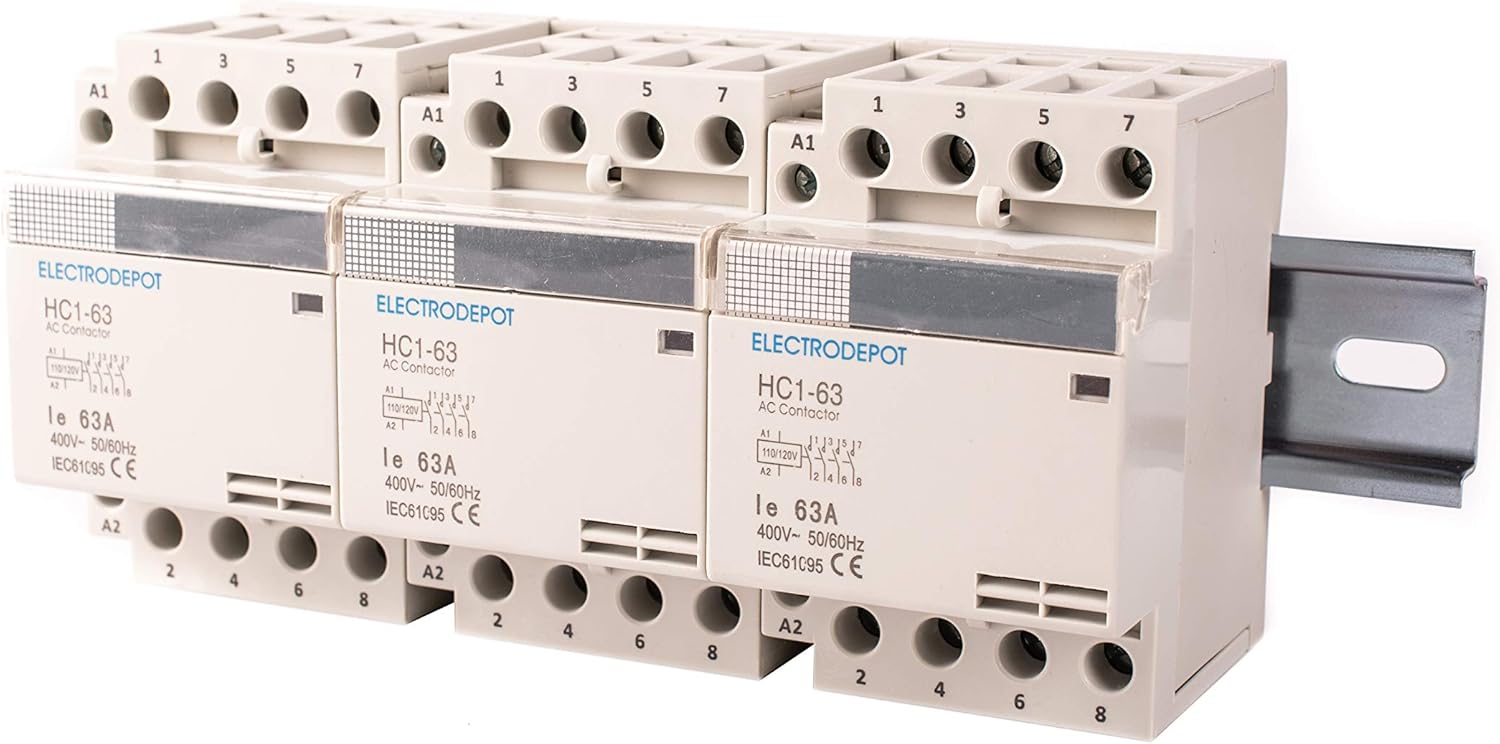 ABOUT CONTACTOR40 Amp 12 Pole Normally Open Contactors (4 Pole x 3) for home or industrial uses.With applications in lighting, motor and switching.Technical Specifications:– Contactor IEC 400V– Contactor Type NO– Inductive Load: 40A– Resistive Load: 63A– DC Load: 30A, @ 24VDC– Power status indicator– Number of Poles 4 x 3– Coil Volts: 110/120VAC, 50/60 Hz– Coil Load: Inrush 52VA, Sealed 10VA– IEC AC Rate: AC-1, 10 kW. AC-3, 8 kW– Electric e strength: 4 kV– Operating Temperature: -30…+70 °C (-22…+158 °F)– 1 HP @ 1 Phase - 120V– 2 HP @ 1 Phase - 230V– 5 HP @ 3 Phase - 208V– 5 HP @ 3 Phase - 230V– 10HP @ 3 Phase - 480V– Weight: 0.88 lb (0.42 kg)– Width: 2.1" (54 mm)– Height: 3.3" (84 mm)– Depth: 2.5" (64 mm)– CE approved 61095, UL pending– Base or DIN 35mm mountWiring:Solid Conductor: 25 mm2 Max torque 0.6 NmStranding Conductor: 16 mm2, Max torque 0.6 NmCompliance:CSA C22.2 No. 14, EN 60947-4-1, EN 60947-5-1, IEC 947-2, IEC 60947-4-1, IEC 60947-5-1, UL 508ABOUT DIN RAILDIN Rails are the standard mounting support for any electromechanical component, device or equipmentdesigned using the DIN specifications adopted by European (EN) and international (IEC) standards.The rail features slots throughout its length making it easy to attach to a panel, wall or equipment.For support of mini circuit breakers, contactors, auxiliary relays, terminal blocks, low voltage apparatuses, etc.– Width: 35mm (1.375”)– Length 200mm (7.87”)– Thickness 5mm (0.2”)ABOUT SCREWSDrive stainless steel truss head screws (#10, 1/2"") for immediate installation.