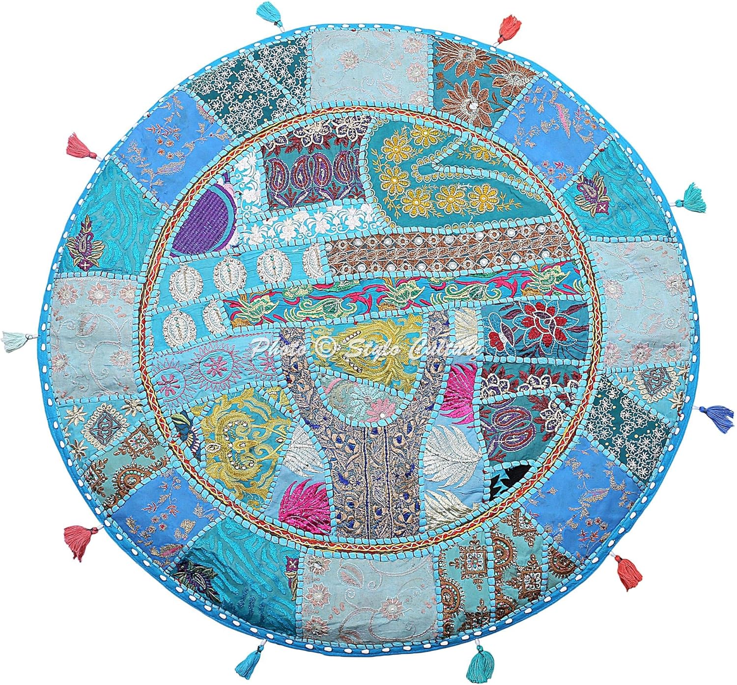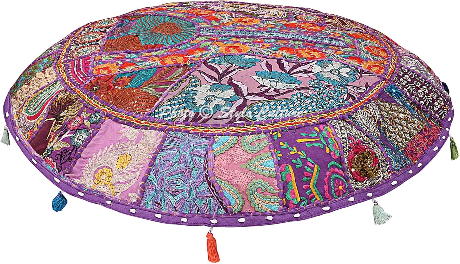 Stylo Culture presents a beautiful ethnic throw pillow cover/floor cushion gaddi studded with heavy embroidery. In this cover embroidered fabric patches are patched and stitched together at random to create a collage like effect and decorated with all kinds of colored threads, patchwork, raised colored thread work and embroidery in intricate designs with beautiful mirror & tassel work. It is a beautiful "Khambadiya" floor cushion cover made by artisans in Barmer, India. Witness the exquisite embroidery and thread work on a vibrant cotton backing, creating a stunning collage bursting with gorgeous patterns and colors! PLEASE NOTE THAT IT IS A COVER ONLY AND THE INSERT IS NOT INCLUDED. The floor cushion cover has a zipper closure at the bottom which can be used to stuff the cover with cotton. The filling can be of cotton, old clothes, beans used in the bean bags or simply you may get it filled from the cotton workers available in your locality. Since the floor cushion cover is made from vintage fabric patches, each cover is unique. THERE WILL BE VARIATION IN THE PATCHES HOWEVER THE BASE COLOR OF THE FLOOR CUSHION COVER WILL REMAIN SAME. There may be slight imperfections due to the products handmade nature which makes the product unique and different from other Floor Cushion covers.