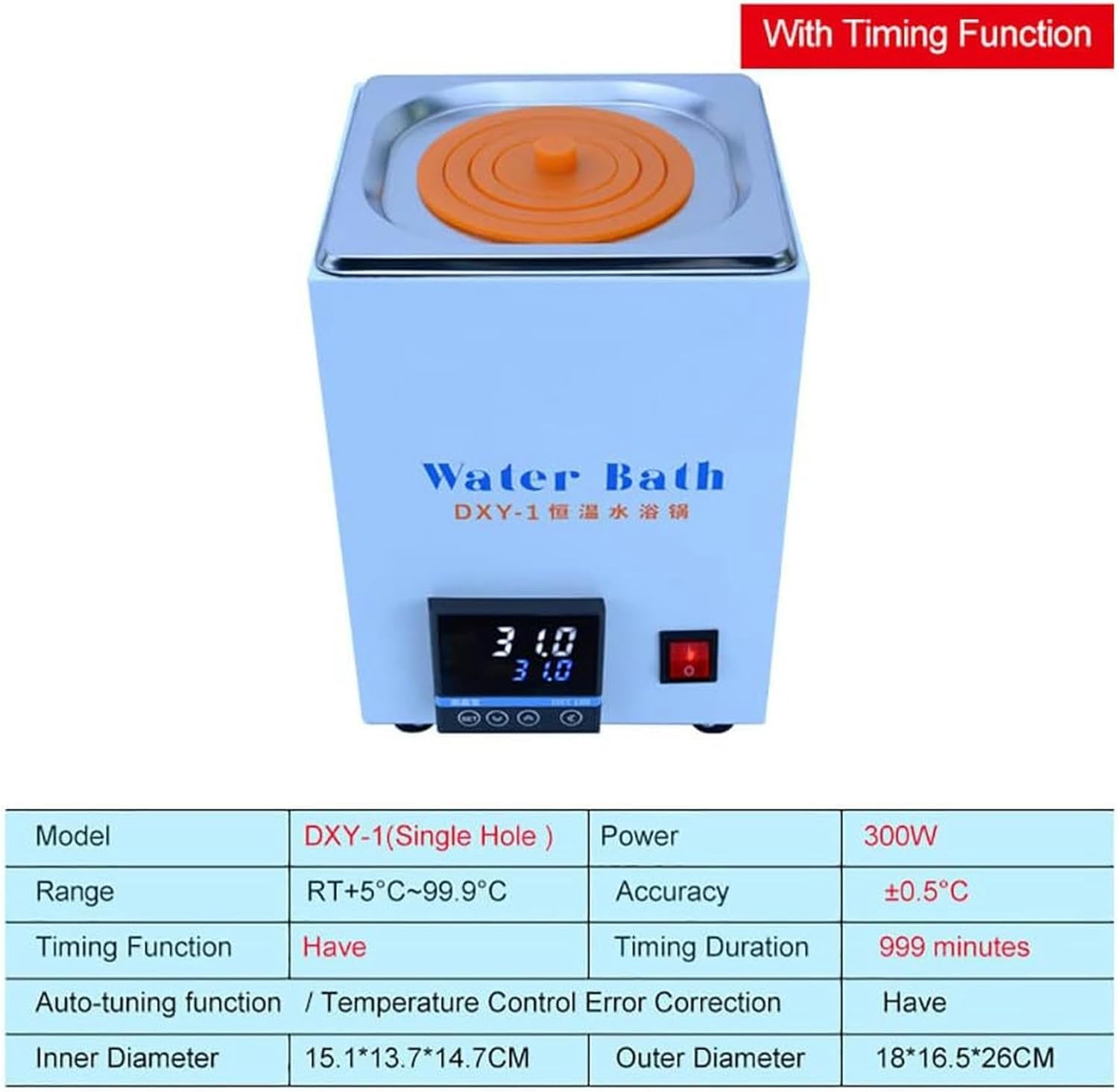 Model Number:The thermostatic water bath is widely used in drying,distillation, concentration, dipping in chemical reagents,pharmaceutical and biological products, can also be used for constant heating water and other temperature test, is a biological, genetic, environmental protection, medicine,aquatic products, health science, biochemistry laboratory,education and scientific research tool.More Accurate Temperature ControlThe temperature can be set freely, and the timing function can be set to make the experiment convenient and convenient. Temperature Control Range : 99.9°C, Resolution : 0.5°C.300W~ 1500W High Power, Rapid Heating.The heating ring is evenly heated from bottom to top, so that the water temperature quickly reaches the set temperature, and the experiment does not wait.Specification:Product name: Constant temperature water bathInput power: AC220V/50HzOutput Power: 300W, 800W, 1000W,1500WNumber of holes: 1 Hole, 2 Holes, 4 Holes, 6 HolesTemperature control range: RT 5 to 99.9°CTemperature control accuracy: ±0.5℃Inner diameter:151x137x147mm,298x151x1147mm, 326x298x147mm, 497x300x147mmOuter diameter:180x165x260mm, 330x182x260mm, 358x 327x260 mm, 530x327x260mmPackage Contents:1 x Digital water bathNote:1. This product has timing function and anti dry burning function. (Not including single hole)2. This product is taken in kind,Due to factors such as light and equipment, there are some color differences.3. Due to the different measurement gestures, the dimensions may vary.