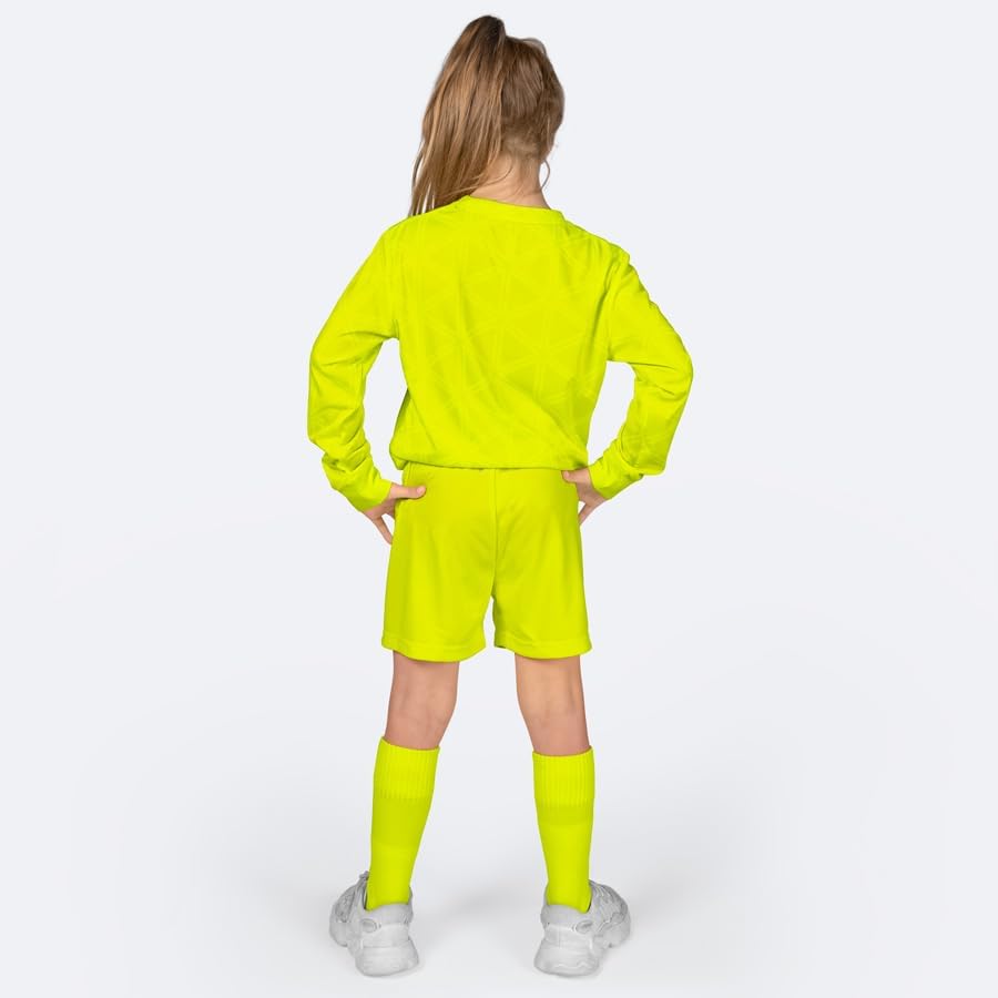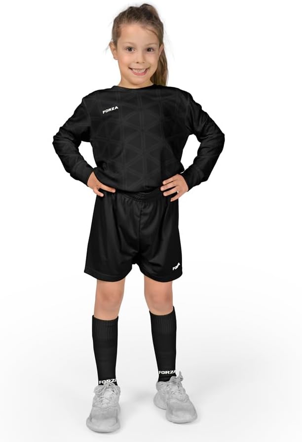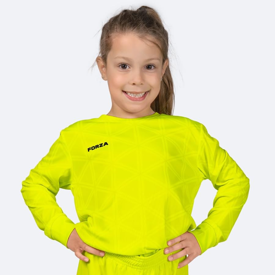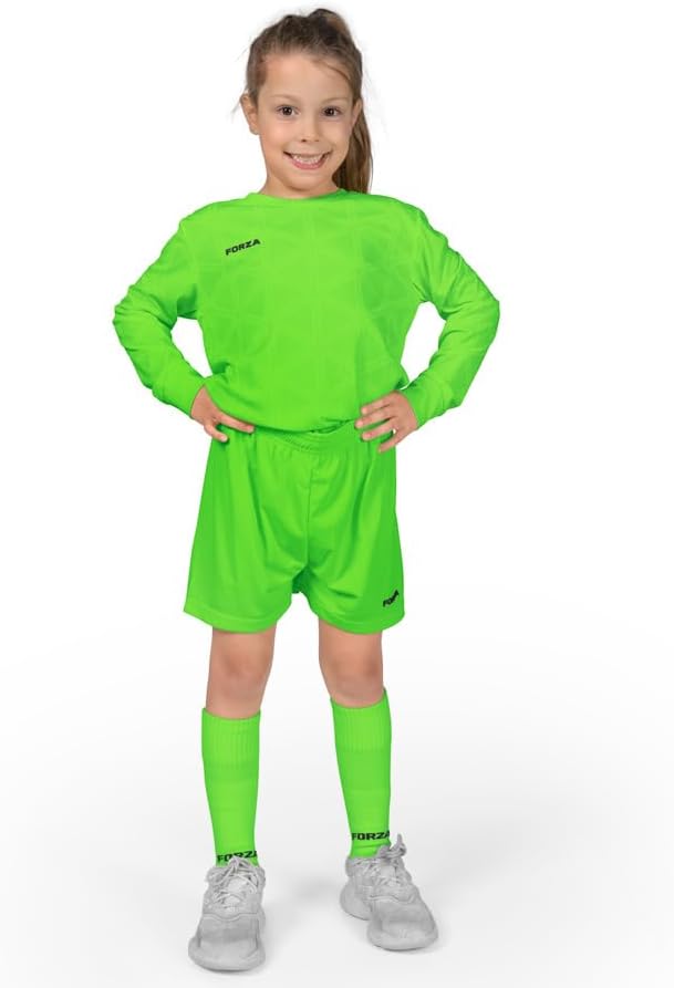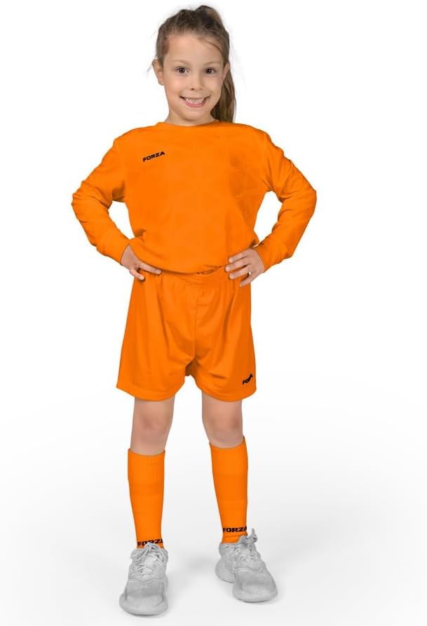 DIMENSIONSSizes: Age 5-6, Age 7-8, Age 9-10, Age 11-12 and Age 13-14For detailed measurements on each size, please refer to the size guide aboveMATERIALS100% PolyesterQuick Dry FabricSweat Wicking properties3D Rubber Brand Logo FORZANon-itch, heat pressed size label on the inside of the necklineFORZA Neck TapeCrew NeckSublimation PrintWASH AND CARE INSTRUCTIONSWash Low CycleWash Inside OutDo Not Tumble DryDo Not BleachIron Low Heat and inside outDry NaturallyCold Wash Max 30°CMISCELLANEOUS1x FORZA Kids' Geo Long Sleeve Soccer Jersey, 1x FORZA Kids Geo Soccer Shorts and 1x pair XS FORZA Geo Knee High Soccer Socks includedAvailable in a choice of 4 fluorescent colors: Fluro Yellow, Fluro Green, Fluro Orange and BlackSuitable for boys and girlsPLEASE NOTE: Once tags have been removed, this set is no longer eligible for return