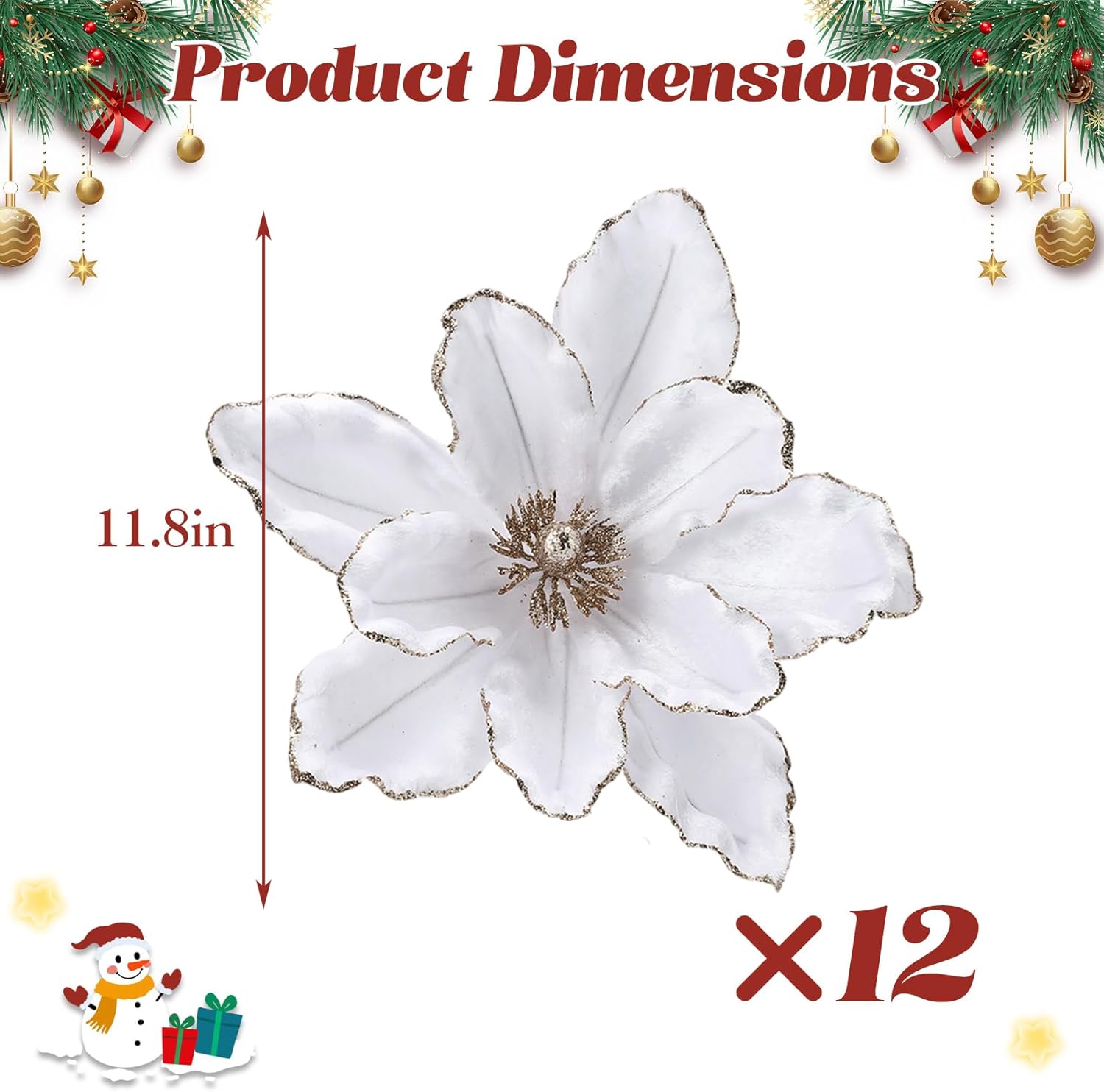 Ready to make your holiday decor unforgettable? Picture these large sparkling artificial Christmas poinsettias lighting up your tree or wreath—can you imagine the festive magic they'll bring to your home this season? Highlights at a Glance: - Eye-catching artificial Christmas poinsettias with sparkling edges and centers that shine under lights - Handcrafted velvet flowers and flexible wire stems create a lifelike, durable holiday accent - Petals easily fold for space-saving storage and unfold for a full, lush look every season - Simple to add to wreaths, garlands, Christmas tree decorations, or table centerpieces - Versatile holiday floral picks bring festive elegance and charm to any room or celebration Specification: Product Name: Artificial Christmas Flower Flower Diameter: 11.8 in Material: Velvet and Metal Color: Red / White Friendly Note: For best results, gently unfold each petal to achieve a full, natural look before decorating. Insert the flexible wire stem into your wreath, tree, or arrangement and adjust as needed. Store folded in a dry place when not in use to keep flowers looking fresh. Packing List: 12 x Christmas Flowers 1 x Assembly Instruction