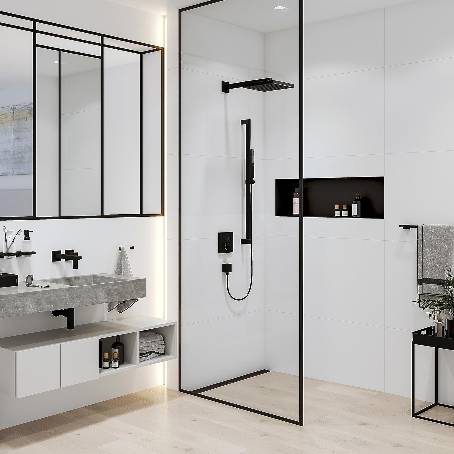 Your stylish companion: Wall connection for hansgrohe Pulsify E shower head The Pulsify wall connection for the 260 overhead shower by hansgrohe is the perfect addition to the Pulsify shower head. The modern shower arm mounts to the wall and ensures the 10.2 in overhead shower is in perfect position. The slim, linear design and angular escutechon also make it a real eye-catcher. The wall connection and Pulsify shower head combination creates a stylish ambience in your bathroom. The expressive Matte black finish in proven hansgrohe quality is easy to clean and remains beautiful.
