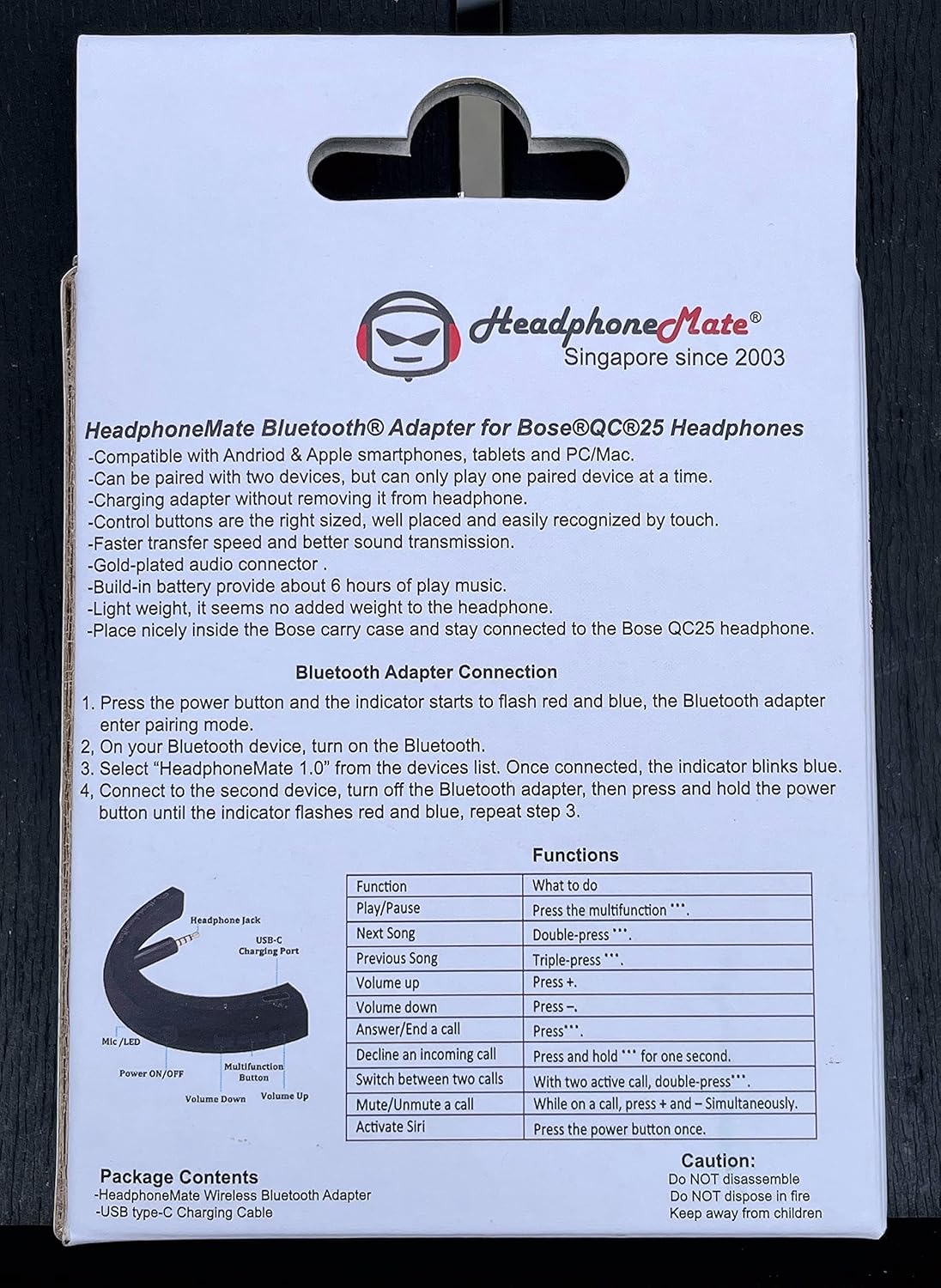 HeadphoneMate is proud to present WIRELESS BLUETOOTH 5.0 ADAPTER for QC 25 headphones. HeadphoneMate products are carefully designed, manufactured, branded and packaged. HeadphoneMate worked with audio technician closely to design this wireless Bluetooth adapter to ensure high performance. All HeadphoneMate products are covered with 100% satisfication guarantee! Not happy with the purchase? Simply send them back for full refund, no questions asked!^ PLEASE NOTE: this adapter is compatible with QC25 only, it does NOT fit any other model of headphones.