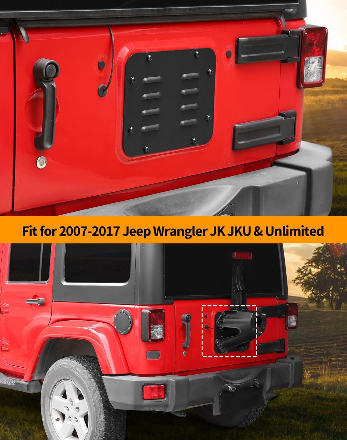 Fitment: Aluminum Wrangler JK Spare Tire Carrier Filler Plate Tailgate Vent Plate Cover Fit for 2007-2017 Jeep Wrangler JK JKU & Unlimited Specifications: Condition: 100% Brand New Size: As The Picture Is Shown Material: High-quality Aluminum Color: Black Package Include: 1 * Spare Tire Carrier Delete Filler Plate 1 * Bolts Kits Product Introduction: Enhance the look & personality & grade of your car, creating an eye-catching look Tailgate vent panel cover is made of aluminum with textured black powder coating on the surface, not fading and rusting, sturdy and durable. Perfect decoration and protection for your Jeep Fix the screws on the original holes of the original car, simple and convenient, not easy to loosen, more will not damage the vehicle.