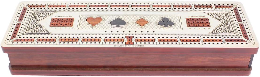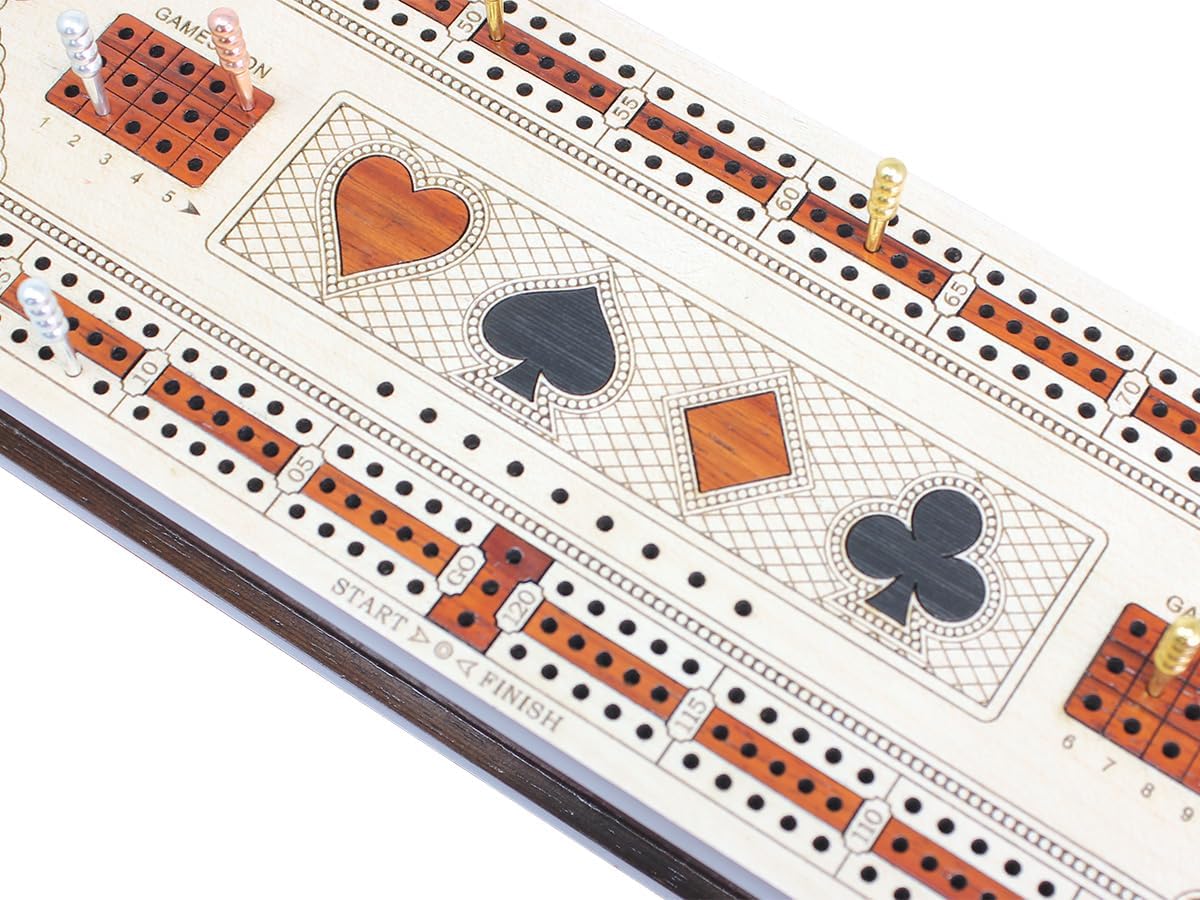 House of Cribbage presents 3 tracks (120 Points) continuous Cribbage Board made for up to 3 players. The board/Box measures 12.5in x 4in x 2in.You can store one deck of poker or bridge cards in the side drawer of this board along with 9 metal pegs.There are 9 slots in the drawer and each slot can store one peg. The magnetic lock on the back of the drawer holds the drawer tightly when it is in the closed position. The pull-out drawer has a brass knob specially designed for strong gripping.The complete board/box has three coats of catalyzed lacquer in a satin finish that provides protection from spills and general wear and tear. Nine brass crib pegs (3 Gold, 3 Silver, and 3 Copper plated) are provided with the board.The handmade cribbage board has been inlaid in Maple wood and Blood Wood. Outer 2 tracks are carved out of Maple wood and the inner track is made of bloodwood. The numbers on the tracks are also engraved and not painted..Playing cards symbol suit has been inlaid on the middle of the board along with games won points. The bottom of the box has a scratch deterrent maroon velvet felt pad which protects the box from scratches and enhances the stability of the board.A free Drawstring velvet bag is also provided to protect the board.We do not use any screen prints or paints to create numbers or tracks on the cribbage board. Designed and crafted by Pleasant Times Industries. All designs, images, concepts, and content are copyrighted and owned by Pleasant Times Industries.Note - Playing cards are not included along with the Cribbage Board.