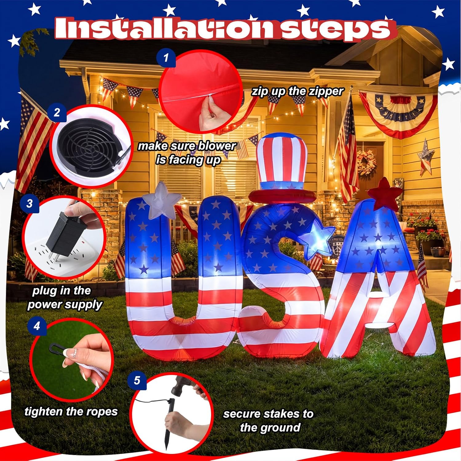Features: Patriotic Color Scheme: The 4th of july inflatable adopting red white and blue colors that represent the spirit of the United States. The color matching is consistent with Memorial Day and 4th of July themes. It coordinates with other patriotic decorations in your outdoor space enhancing the overall festive atmosphere. Patriotic Decoration: Patriotic outdoor inflatables suitable for both residential outdoor areas and commercial event venues such as community centers and storefronts. It adds a strong patriotic touch to Independence Day Memorial Day and other related celebrations. It is a have decor item for anyone who wants to celebrate national holidays. Specifications: Material: polyester, plastic, nylon Color: blue, white, red Size: Outdoor inflatable decorations: about 6.5 x 4.76 ft/ 1.98 x 1.45 M Package includes: 1x Outdoor inflatable decorations 1 x Fan 1 x Jutai adapter 2 x Light 2 x Water bag 2 x Ropes 4 x Ground pegs Notes: Manual measurement, please allow slight errors on size. The color may exist a slight difference due to different screen displays