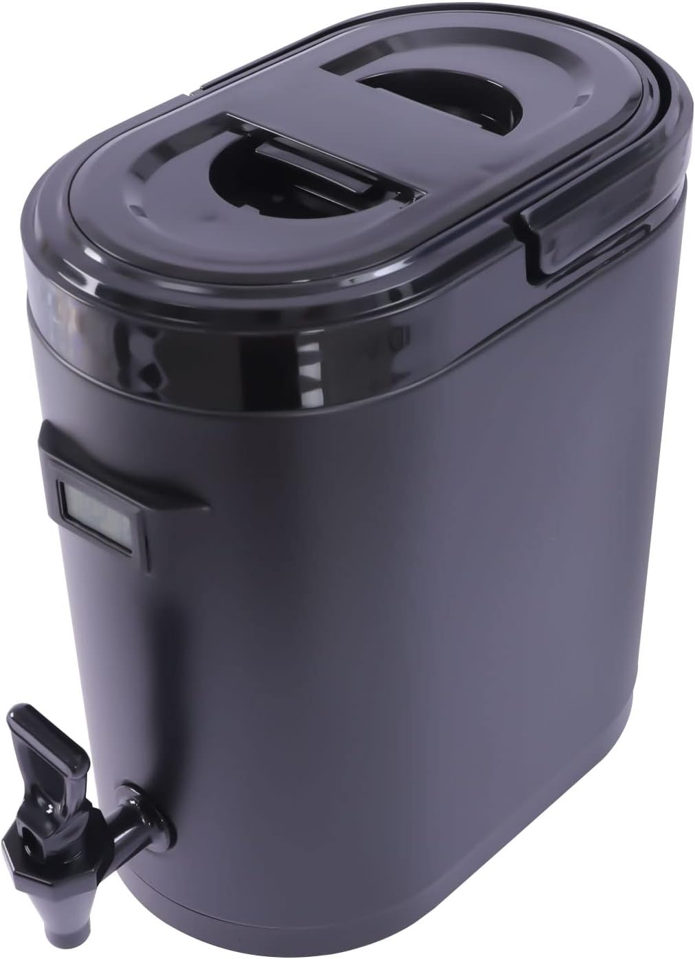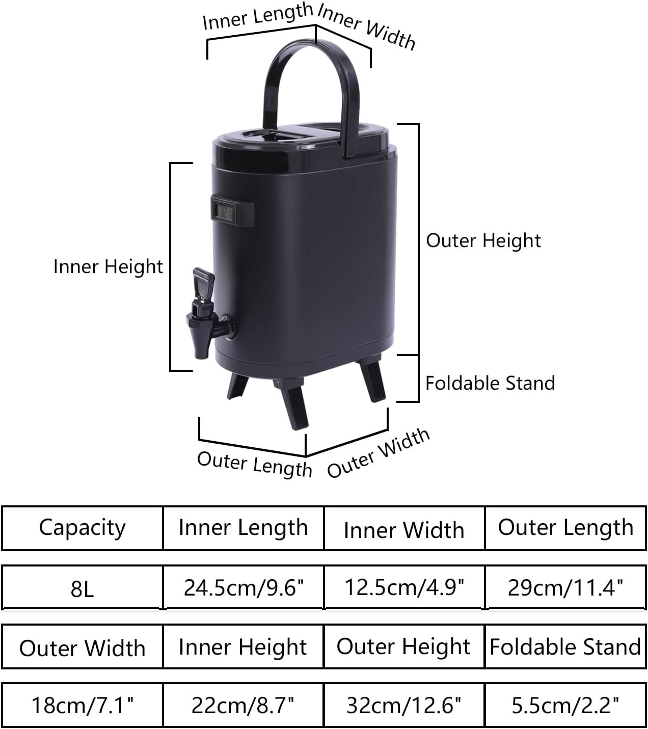 ApplicationIt can be added to coffee, tea, water, milk, soup, etc. And it can be used in cafes, buffets, offices, hotels, kindergartens, outdoor, tea houses, camping, gardens, wedding receptions, construction sites, or various large events or celebrations.Thermal Insulation testRoom temperature 24°C/75.2℉, filled with boiling water at about 95°C/203℉.1. Above 85°C/185℉ for 3 hours.2. Above 68°C/154.4℉ for 6 hours.3. Above 50°C/122℉ for 12 hours.4. Above 40°C/104℉ for 24 hours.Cold Insulation TestRoom temperature 24°C/75.2℉, filled with cold water at 0-5°C/32-41℉.1. Below 3°C/37.4℉ for 3 hours.2. Below 6°C/42.8℉ for 6 hours.3. Below 10°C/50℉ for 12 hours.4. Below 20°C/68℉ for 24 hours.SpecificationCapacity: 6L/ 1.6GalColor: BlackShape: OvalInsulation Material: PU Full FoamInner Liner Material: 304 Stainless SteelKeep Warm Time: Up to 24HGross Weight: 3.6kg/7.9 lbNet Weight: 2.9kg/6.4 lbProduct Size: 29*18*28cm/11.42*7.09*11.02inchInner Length: 24.5cm/9.6inchInner Width: 12.5cm/4.9inchOuter Length: 29cm/11.4inchOuter Width: 18cm/7.1inchInner Height: 18cm/7.1inchOuter Height: 28cm/11inchFoldable Stand: 5.5cm/2.2inchPackage Size: 40*24*36cm/15.7*9.4*14.1 inchPackage Included1* Insulated Beverage DispenserNotes1. In actual use, the heat preservation performance may differ from the factory data due to various factors such as working environment, temperature, and humidity.2. Please allow the slight color difference caused by the shooting light and 1-3cm error due to manual measurement, and make sure you do not mind before ordering.