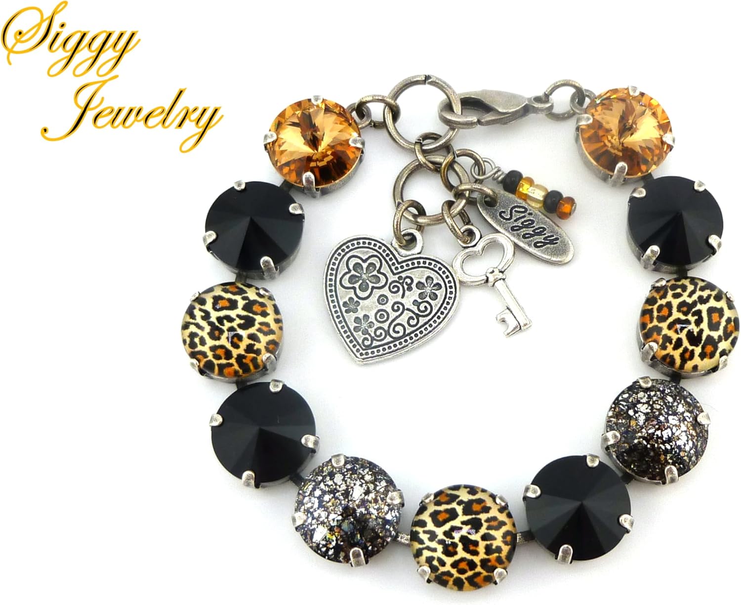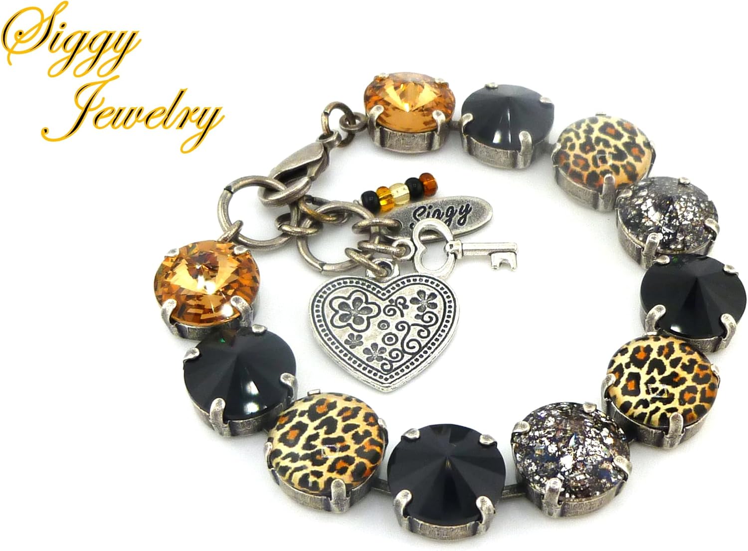 Fun, eye-catching, and edgy, this rivoli tennis bracelet is made with genuine Austrian crystals in jet black, black patina, and light Colorado topaz. It is accented with animal print, leopard-colored cabochons, all set in an antique silver-plated setting. Cute charms and a Siggy tag complete the look.