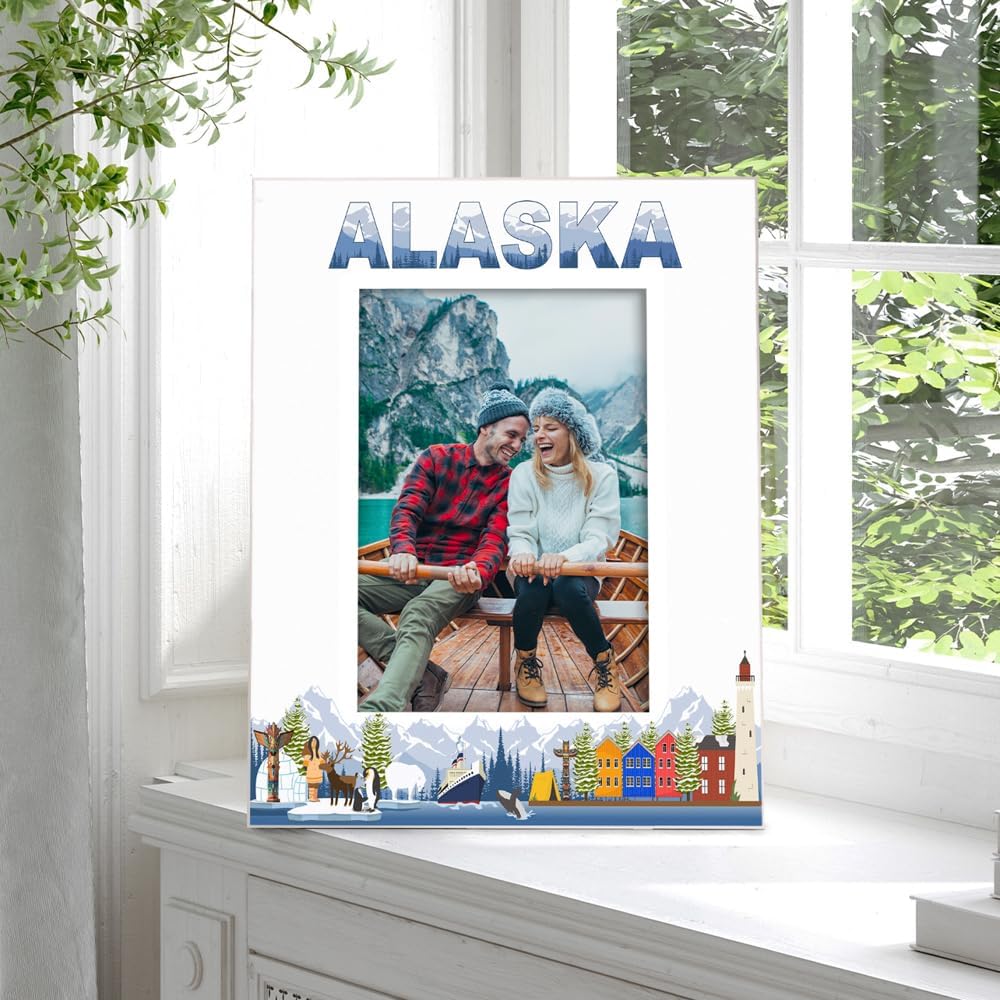 Elevate your home décor with this beautifully crafted wooden picture frame, designed to bring the spirit of Alaska into your living space. Printed with superior UV gloss that not only enhances the image but also provides a layer of protection, your memories are preserved in stunning clarity. The frame highlights the serene beauty of Alaskan scenery, complemented by whimsical illustrations of the state's renowned wildlife and picturesque towns. Whether it's a quiet moment shared between loved ones or the solitary grandeur of Alaska's landscapes, this frame is an ideal choice for those who want to keep their Alaskan memories alive. A perfect gift for friends and family, it's a stylish reminder of where you've been and the experiences you've treasured.