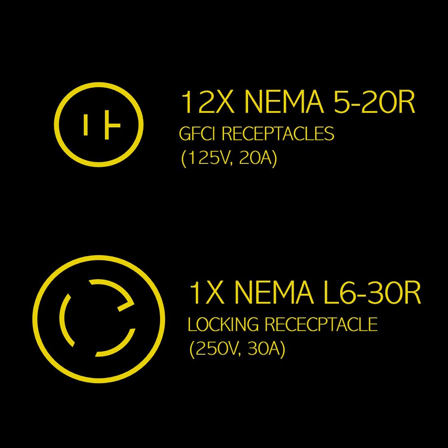 • Unit includes 12 NEMA 5-20R GFCI-protected receptacles (six duplex) and one L6-30R receptacle.