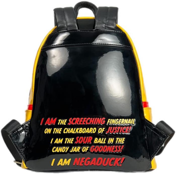 This bag is limited to 1000 Pcs. It is Exclusive to World 1-1 Games. Bring your fondest memories of Disney Afternoons to life! With yet another awesome Loungefly exclusive in the Darkwing Series, It's NEG DUCK! This absolutely FANominal likeness of the Villains from Darkwing Duck, his most impressive evilness Nega Ducka stands out with all of its unique details like the real buttons on his jacket, the iconic purple costume, and the prominent bill of his hat and of course the enamel charm his cool motorcycle. The mini backpack is faux leather with a custom fabric lining, gold tone hardware, and adjustable shoulder straps. Bag Measurements are W: 9" x H: 10.5" x D: 4.5" This bag is an Officially Licensed Disney product.