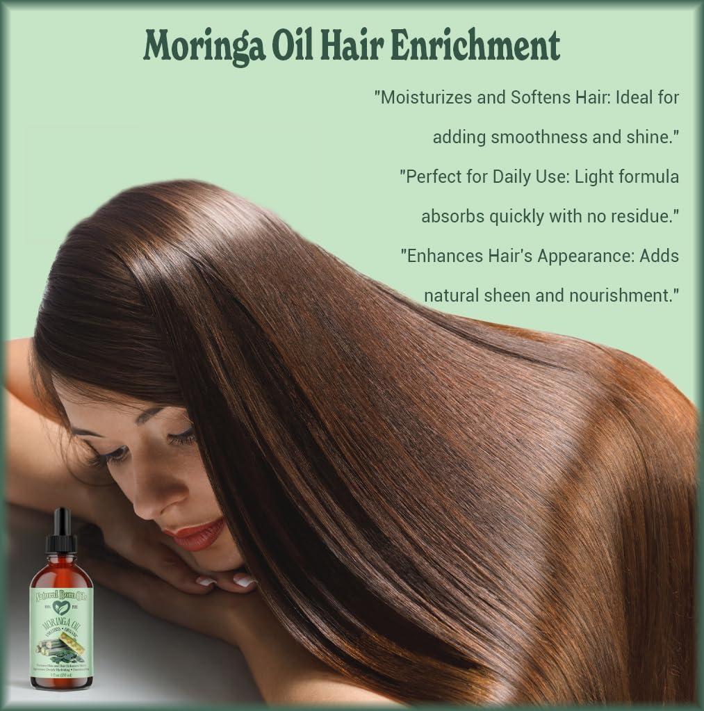 100% PURE MORINGA OILBotanical name: Moringa oleiferaCold-Pressed, Unrefined, Organic Natural Moisturizer for Skin and HairThis lightweight oil provides moisture and nourishment for skin and hair, leaving them feeling smooth and hydrated.Containing oleic acid, Moringa Oil is perfect for everyday use, suitable for all skin types. Use directly on skin or mix it with essential oils for your own custom blend.100% pure. Organic. Unrefined. Cold pressed. Natural. Vegan. Easily absorbed. Highly moisturizing. Lightweight. Paraben-free. Sulfate-free. Colorant-free. Preservative-free. Additive-free. Cruelty-free. Bottled in the USA.Origin StoryThe Moringa tree, native to India, produces seeds that yield a greenish-gold oil after cold-pressing.The ProcessThe oil is cold-pressed from the seeds of the Moringa Tree, ensuring the preservation of its nutrients and antioxidants.