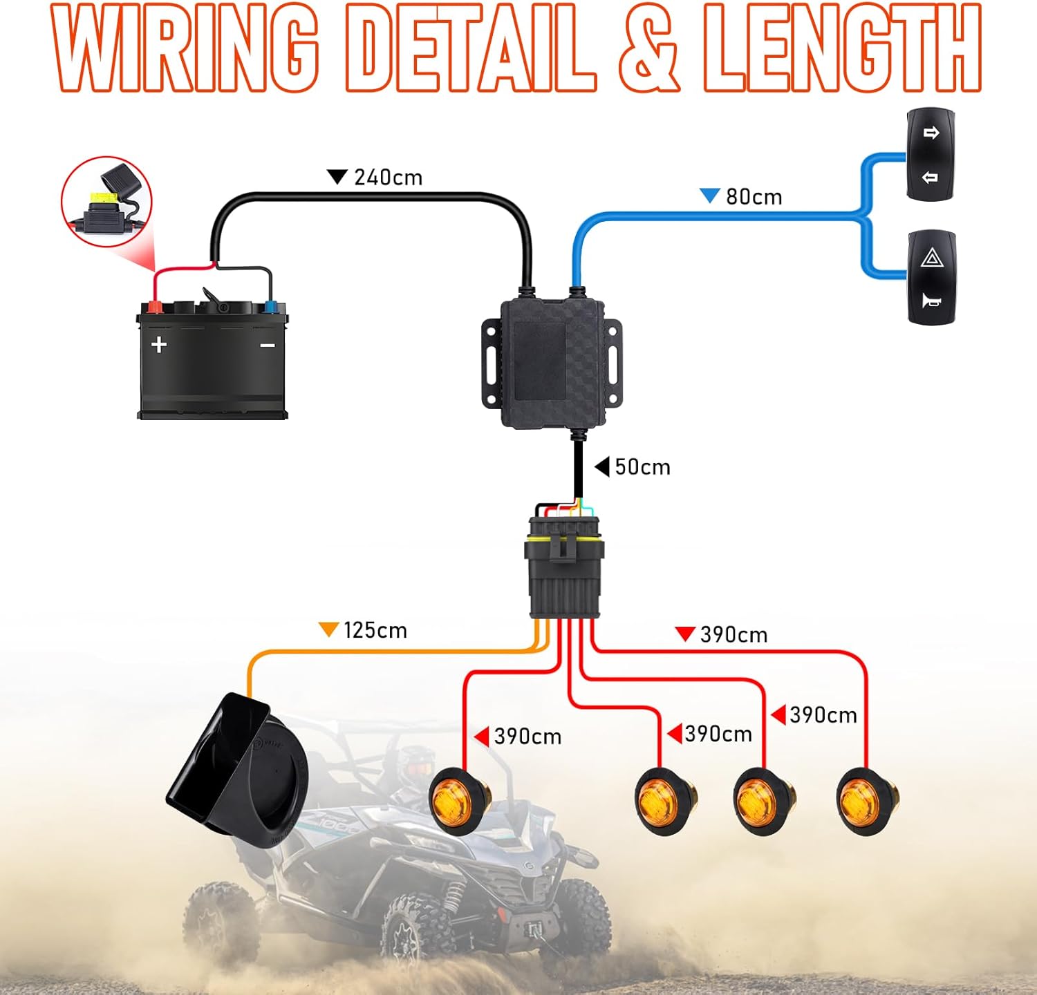 | Additional Features | 20A Fuse, 4pcs Amber Led, Strong Horn |