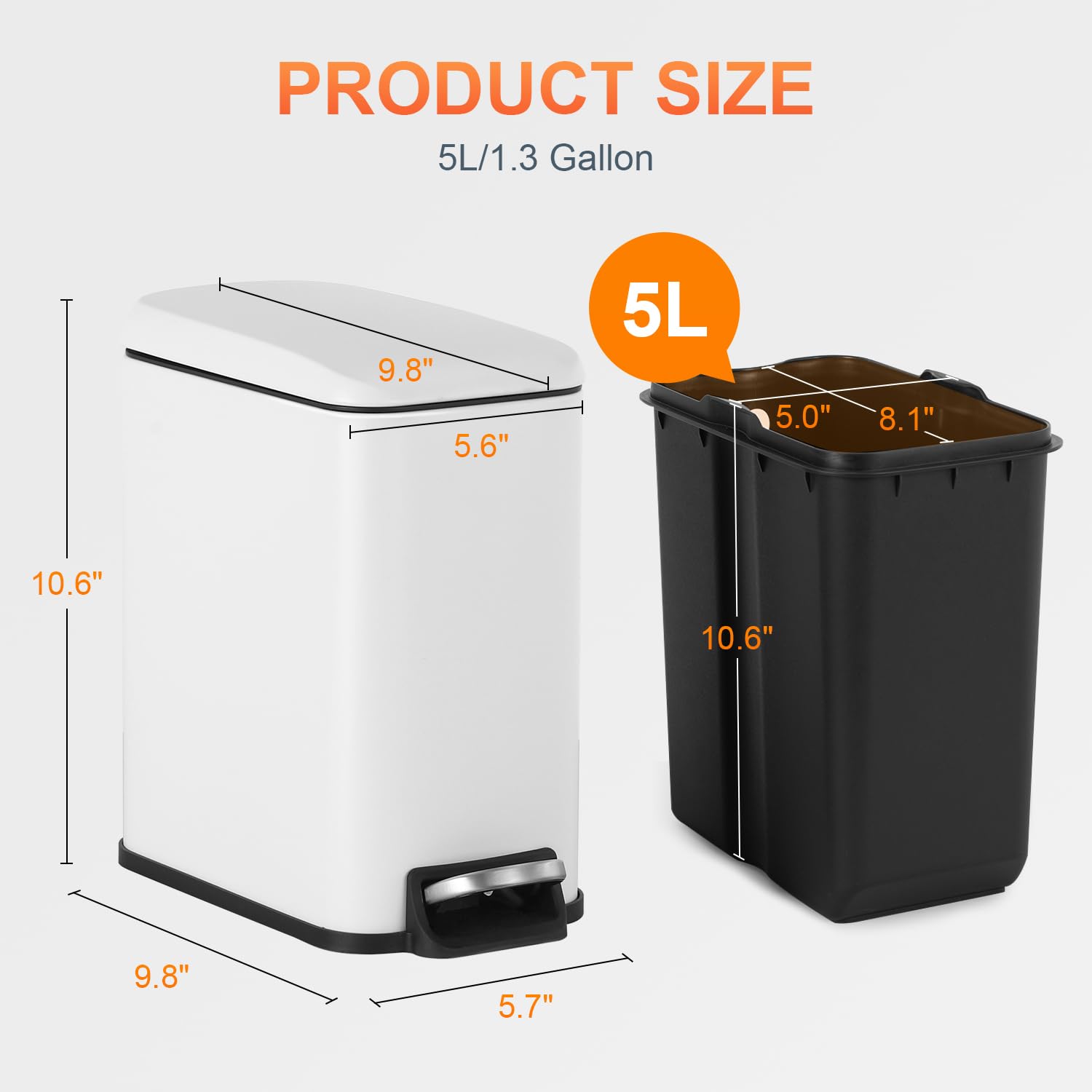 Improve your waste management with this 1.3-gallon (5L) stainless steel trash can. This sleek can's compact shape allows it to fit perfectly into small places, and its removable inner bucket makes cleaning a snap. Enjoy hands-free operation with a robust, non-slip pedal that is simple to use. Additionally, the built-in odor control keeps your home smelling fresh. Ideal for kitchens, baths, and offices.