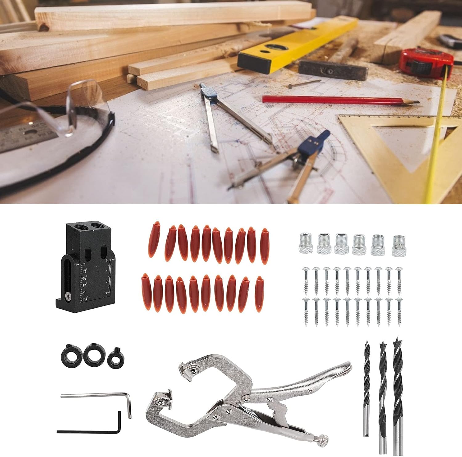Item Type: Pocket Hole JigMaterial: Aluminum alloyPerforation Thickness: Approx. 0.64cm / 0.3in1.27cm / 0.5in1.91cm / 0.8in2.5cm / 1in3.18cm / 1.3in1 ~ 3cm / 0.4 ~ 1.2inPerforated Hole Diameter: Approx. 6mm / 0.2in8mm / 0.3in10mm / 0.4inPunching Angle: 15°Package List:1 x Positioner6 x Drill Socket2 x Hex Wrench1 x 6mm Drill Bit1 x 8mm Drill Bit1 x 10mm Drill Bit3 x Fixed Ring1 x Clip20 x Wedge20 x Screw