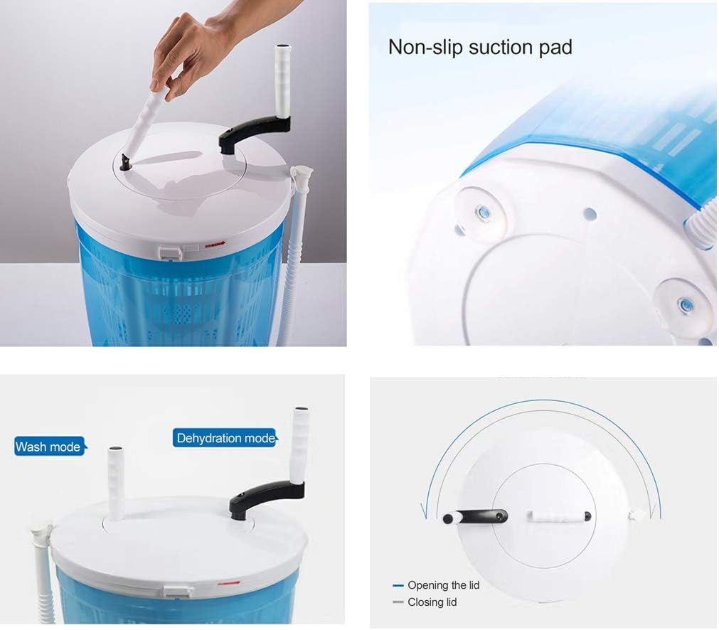 High Efficiency With a 40-50% spin rate, this spin dryer is more efficient than other manual spin dryers.[PRODUCT PARAMETERS] Product name:mini cranked washing machine Colour:Blue Product material:Polypropylene Product size:350x350X340MM Door opening method:top open Washing capacity:2KG Washing method: manual Speed: 600 rpm [FEATURE] 1. The compact size of this washing machine makes it fully portable, ideal for compact environments 2. Please note that it is not a fully automatic washing machine and may require more work after washing.