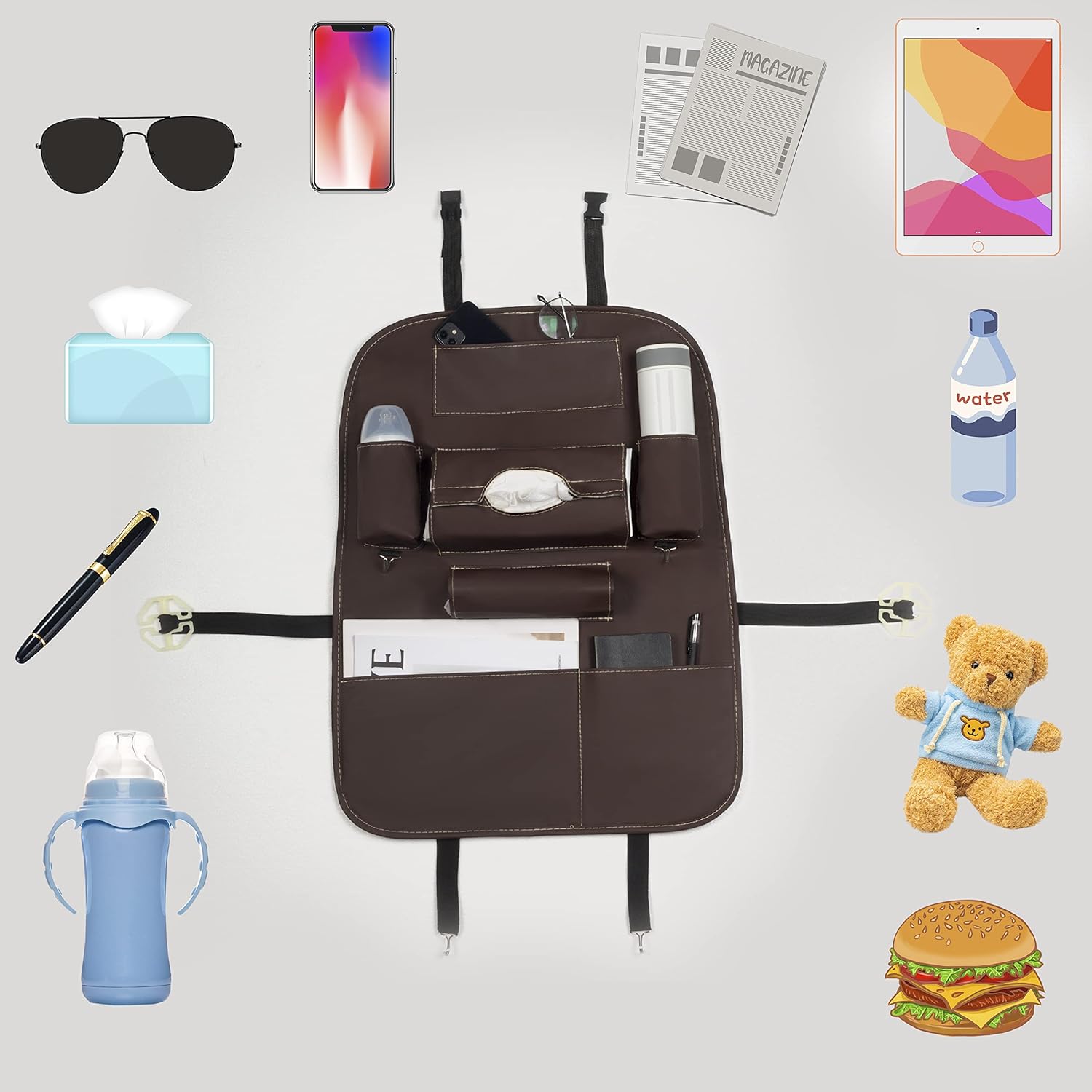 Features: 1. ASENDIWAY backseat organizer is great to keep your car organized, clean and tidy and protect your seat from getting scratched. Suitable for most of cars, vehicles and SUV. 2. The kids organizer back seat is made by high quality PU Leather can protect your seats from scratches, spills, stains, scuff marks, mud, dirt and getting worn out. Ideal for those with kids and pets as well 3.car back seat organizer foldable tray can be put down as dining table and also as a work desk to hold your tablet. Note: It is made of hard board, bear up to 3kg items. The fantastic car organizer will bring you and your family one comfortable and tidy car trip.4. It's durable and safety, easy to intall, it takes less than a minute to install the organizer, just buckle up the headrest strap and insert the bottom buckle under the seat. 4. Our kids car organizer is designed to perfectly hold your children's storage needs securely in place. Tissue holder wet wipes, snacks, headphones, bottles, crayons, umbrella; there is a place for them on this organizer . 5. The backseat car organizer with tissue holder and cup holder can store a lot of things like magazines, CD, Tissue Box, book, snacks and drinks etc 6.It is a very helpful organizer for your car, which maximizes the space in your car 8.No prison and smell without wasting time to wash 9.The kick mats back seat protector organizer can be used in any car, especially for high-class cars, highly ornamental value Specification: Material: PU Leather Installation: Simply attach the top strap to the headrest and then use the heavy duty elastic strap to wrap around the bottom portion of the seat Not applicable for the car seat types listed below : The front seat which is integrated with the headrest; The front seat which doesn't have a headrest; The front seat which has a TV on it or an uneven back;Package Included: 2x Seatback Organizers