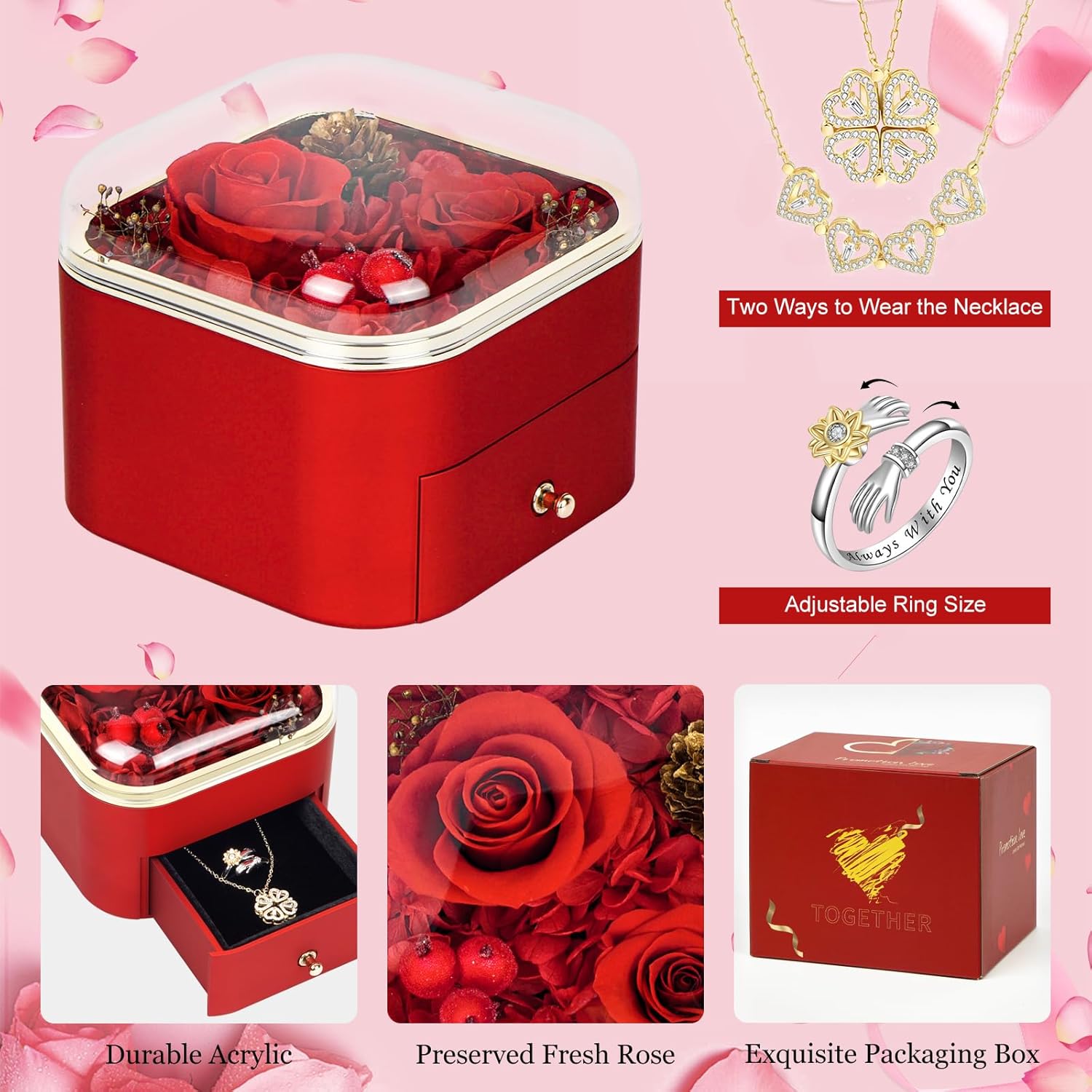 Valentines Day Gifts for Her, Preserved Rose with Necklace & Ring, Gifts for Women, Girlfriend, Mom and Wife on Valentines Day, Mother's Day, Birthday, Christmas, Anniversary Gifts for Her