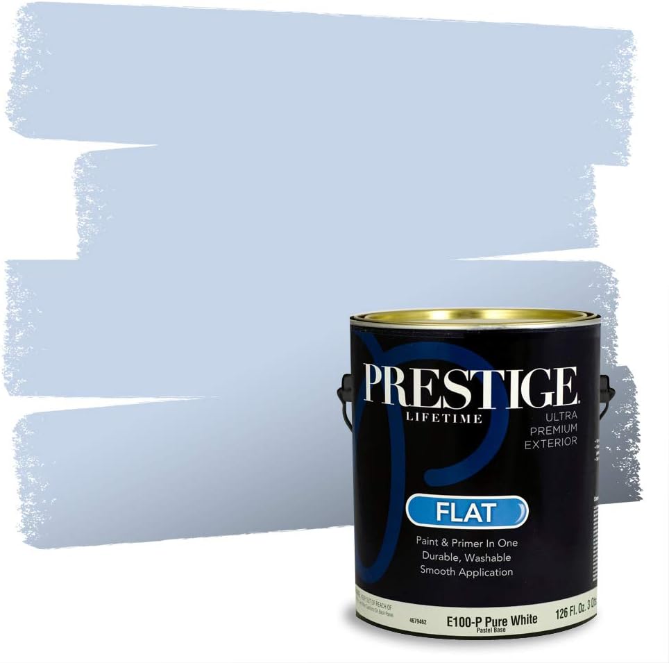 Prestige Paints 100% acrylic exterior latex paint and primer in one is a high end paint intended to be used on exterior surfaces including properly prepared wood, masonry surfaces, cement board siding, vinyl*, aluminum, and factory primed siding. This durable, washable paint combines fade resistance, stain resistance and ease of cleaning, providing a long-lasting finish that can withstand wear and tear while remaining easy to maintain. Semi-gloss finishes provide walls with a shiny appearance and brighten a wall's appearance. Off-whites and pale shades of lighter colors are punched up and made brighter by the glossy effect created with these finishes. They are ideal for use in areas with high humidity. They are also the easiest to clean (with light scrubbing or wiping), compared to other finishes. The downside to a gloss finish is that it shows almost every imperfection on a wall. Average coverage 250-400 sq. ft. (23-37 square meters) per gallon. Surface Preparation: Remove dirt, grease, wax and soap residue, loose and peeling paint. Glossy areas must be dulled by sanding. New woods may require an oil base primer/sealer. On metal use proper rust primer. Application: Stir or mix paint before using and intermix all containers for color uniformity. Apply as is with a high quality brush, roller or pad painter. Thin sparingly with water if necessary for spraying. Do not overspread. Temperature must be above 50 F (10 C). For best performance, apply two coats of paint on new surfaces. Do not use indoors. Dry Time: Dries in 1 to 2 hours. Allow to dry overnight before recoating. Low temperature or high humidity may increase dry time. Cleanup: Use warm water and soap. Monitor-rendered and printed colors may vary from actual paint colors due to differences in color calibration between digital devices and the physical properties of pigments, lighting conditions, and printing techniques. Note that paint color can vary due to sheen, light, surface, and application method. *(Note: When painting vinyl siding do not paint with any color darker than the original siding. Painting with darker colors may cause the siding to warp.)