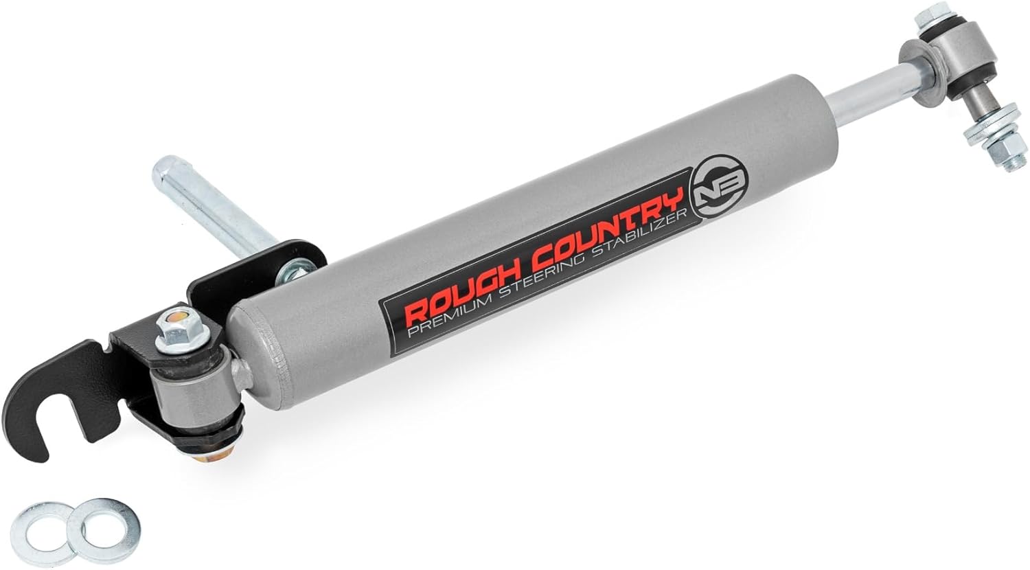 Take Control of Every Turn: Rough Country's N3 Steering Stabilizer Kit is engineered to eliminate bump steer, front-end shimmy, and steering vibration caused by rough roads or oversized tires. Whether you're hitting the trail or the pavement, it delivers a smoother, more predictable ride by dampening harsh feedback through the steering wheel.Fix Common Steering Issues: If your vehicle pulls to one side, feels loose after hitting a bump, or suffers from a shaky steering wheel - this stabilizer helps correct those problems. It absorbs sudden impacts that can throw off your handling and alignment, especially in lifted applications.Protect Your Steering System: Rough Country's stabilizer helps reduce wear and tear on key components like tie rods, ball joints, and tires. It's a must-have for vehicles running larger wheels or off-road setups, helping preserve performance and extend component life. The durable 18mm chrome hardened piston rod and large-bodied cylinder dwarfs factory equipment, ensuring a more effective vibration damping each and every time you take to the trails.Bolt-On Upgrade with Big Benefits: With a 100% bolt-on design, installation is fast and hassle-free. It's one of the easiest ways to improve handling, reduce road feedback, and reinforce the reliability of your steering system - backed by the trusted Rough Country name.