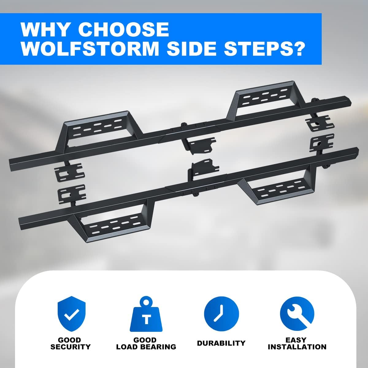 Running Boards improves the vehicle practicality by making it more convenient to enter and exit your vehicle. It can protect vehicle side paint from scratches and allows easier rooftop operations such as accessing the luggage rack, cleaning roof, etc.SIDE STEPS | NERF BAR | RUNNING BOARDS REPLACEMENT FITMENT:For 2019-2026 Dodge Ram 1500 Crew Cab 4 Door Side Step | Please Confirm the product is compatible with your vehicle before purchaseSPECIFICATION:Color: BlackMaterials: Electro-galvanized "E-coat" Layer SteelInstallation: Bolt-OnSurface Finish: Black Powder Coated SteelSide Steps Size: 79 x 8.2 x 4.5 inchInstallation-type: Direct bolt-on with no drilling requiredPACKAGE INCLUDED:2x Side Steps (left and right side)1x Mounting HardwareHeavy Duty BuildCold rolled steel with a black powder coat for corrosion protection and durability. Sturdy construction - can meet different wild off-road driving challengePerfect for Off-road UseThese Rock Sliders provide excellent protection for the side and undercarriage of your ram while rock crawling. The durable non-slip step pads ensure an easy entrance and exit from your Ram; SAFETY RIDE HEIGHTHigher ground clearance, more collision avoidance,keep your ram safe even in extreme weather and dangerous condition with excellent function.NON-SLIPThe laser cutting step plate achieves a non-slipping step surface and reinforced grip. Proven to handle up to 450 lbs. without bending.Easy No-Drill InstallationSetting up these side step bars is fairly easy and can be installed by anyone with light to mechanical skills. Using the supplied brackets and hardware, these side step bars can be securely mounted to your vehicle’s factory location points. No drilling is required.