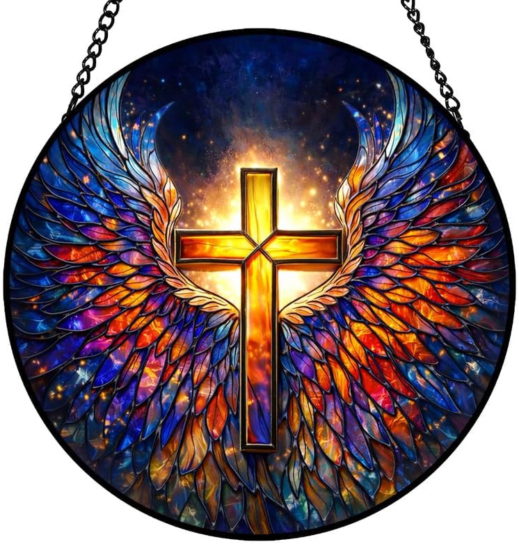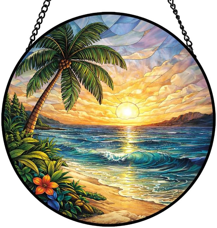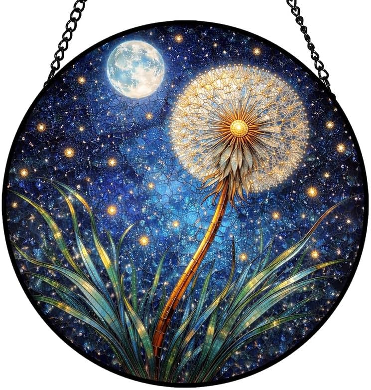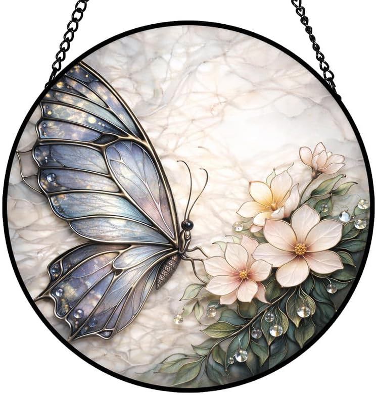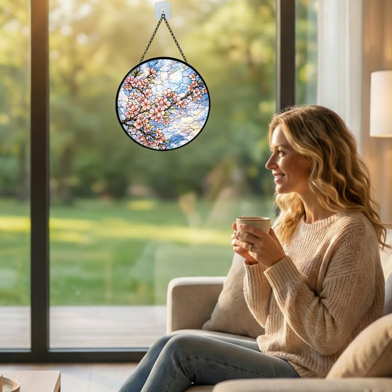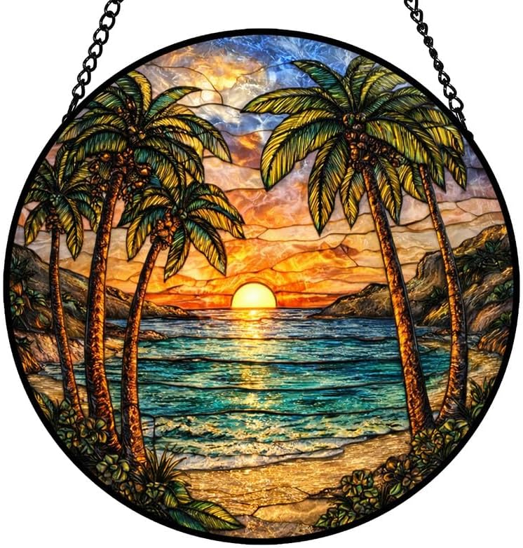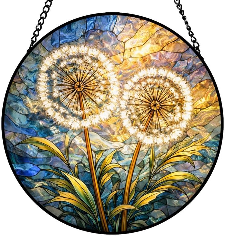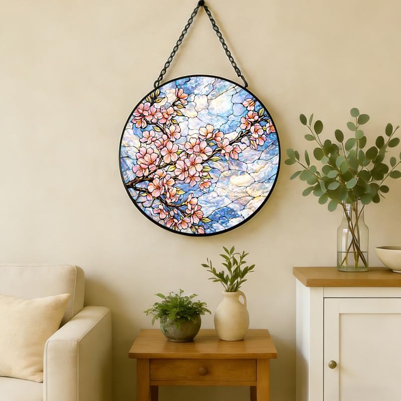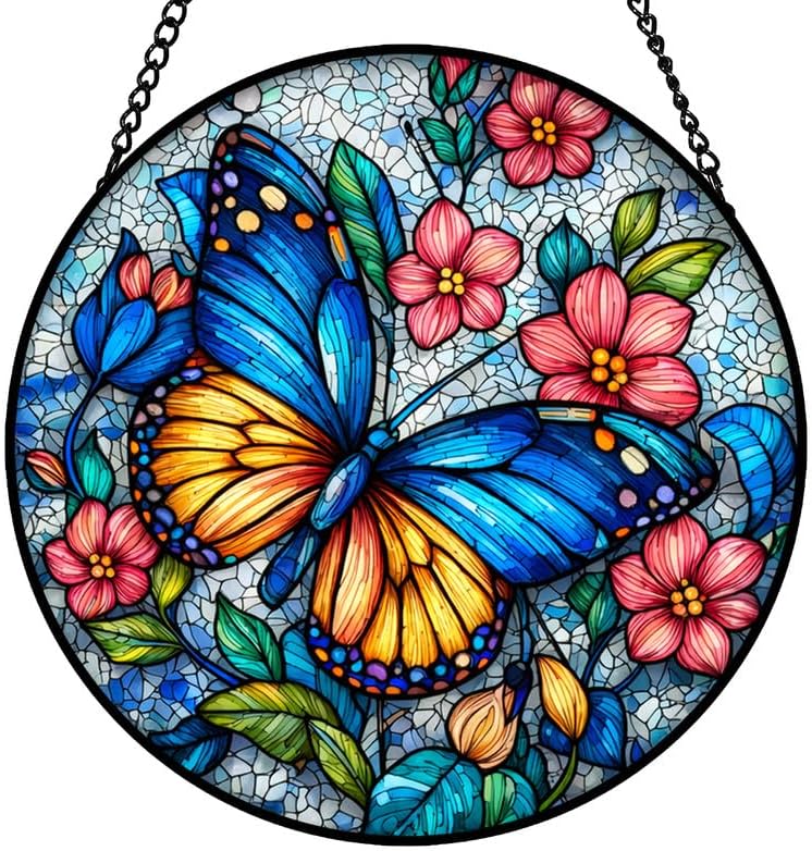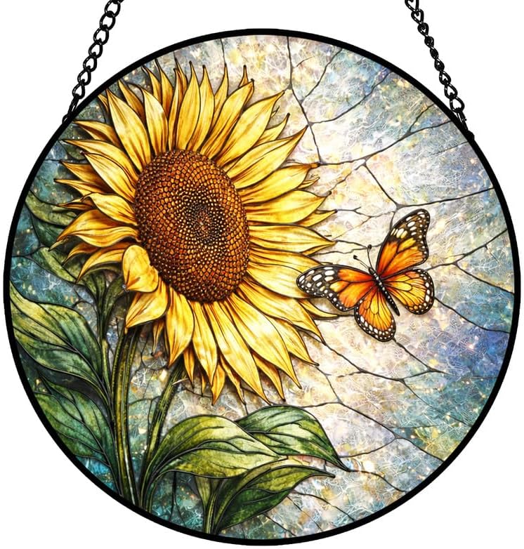 Add a touch of color, light, and artistic beauty to your home with this stained glass window hanging suncatcher. This decorative glass panel is designed to catch sunlight and transform it into warm, colorful reflections, creating a peaceful and charming atmosphere in any space. Whether placed in a window, kitchen, living room, bedroom, or balcony, it instantly becomes a beautiful focal point. Crafted from high-quality colorful glass with a sturdy metal frame, this suncatcher is durable, fade-resistant, and made for long-term use. The smooth finish and solid construction ensure both safety and elegance. With its 11.8-inch size, it is easy to hang and perfectly sized for most windows without blocking natural light. It complements a wide range of interior styles, including modern, vintage, boho, farmhouse, and classic decor. This stained glass window hanging is not only a charming decoration for your own home, but also a thoughtful gift for housewarmings, birthdays, holidays, or special occasions. A beautiful way to share light, color, and warmth with friends and family.