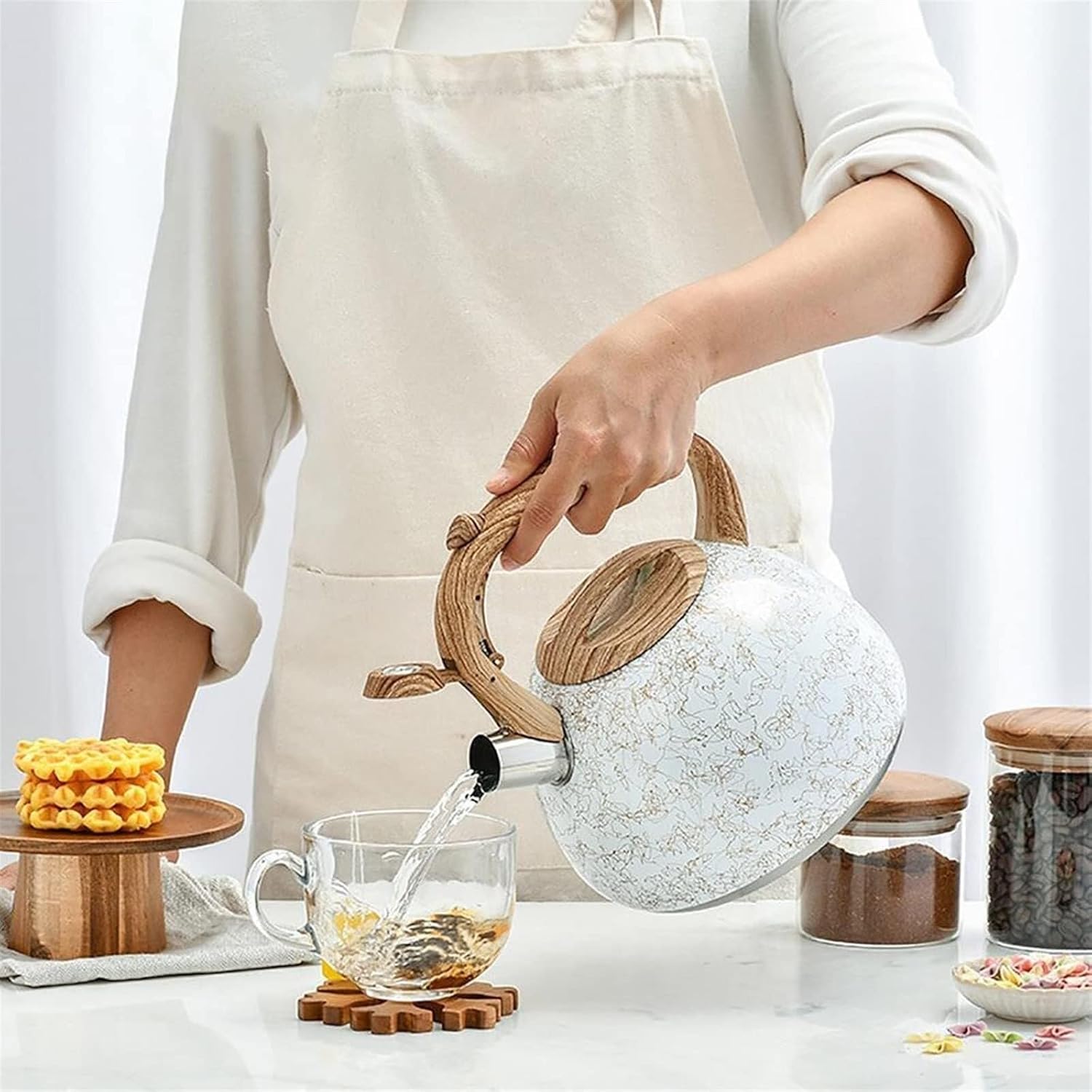 The Stainless Steel Camping Kettle with a wood grain handle combines style and functionality for all your outdoor and indoor needs. Whether you're camping, having a picnic, or enjoying a quiet moment at home, this teapot makes boiling water easier and more efficient.Crafted from food-grade stainless steel, this teapot is , rust-resistant, and designed to withstand frequent use. The wood grain nylon handle offers a comfortable grip, ensuring you can pour your hot beverage without risk of burns. Plus, its heat-resistant design makes it perfect for use in a variety of settings.The whistle feature adds an extra layer of safety by alerting you when the water reaches boiling, while the 3-layer metal base guarantees even heat distribution for fast boiling. This teapot is compatible with all types of stoves, including gas, electric, ceramic, halogen, and wood stoves, offering versatility for your kitchen or outdoor cooking needs.This kettle is not just practical, but also stylish—with its line design and wood grain handle, it adds a touch of elegance to any kitchen. Whether you're brewing tea, coffee, or boiling water, this stainless steel kettle is your ideal companion for both indoor and outdoor adventures.