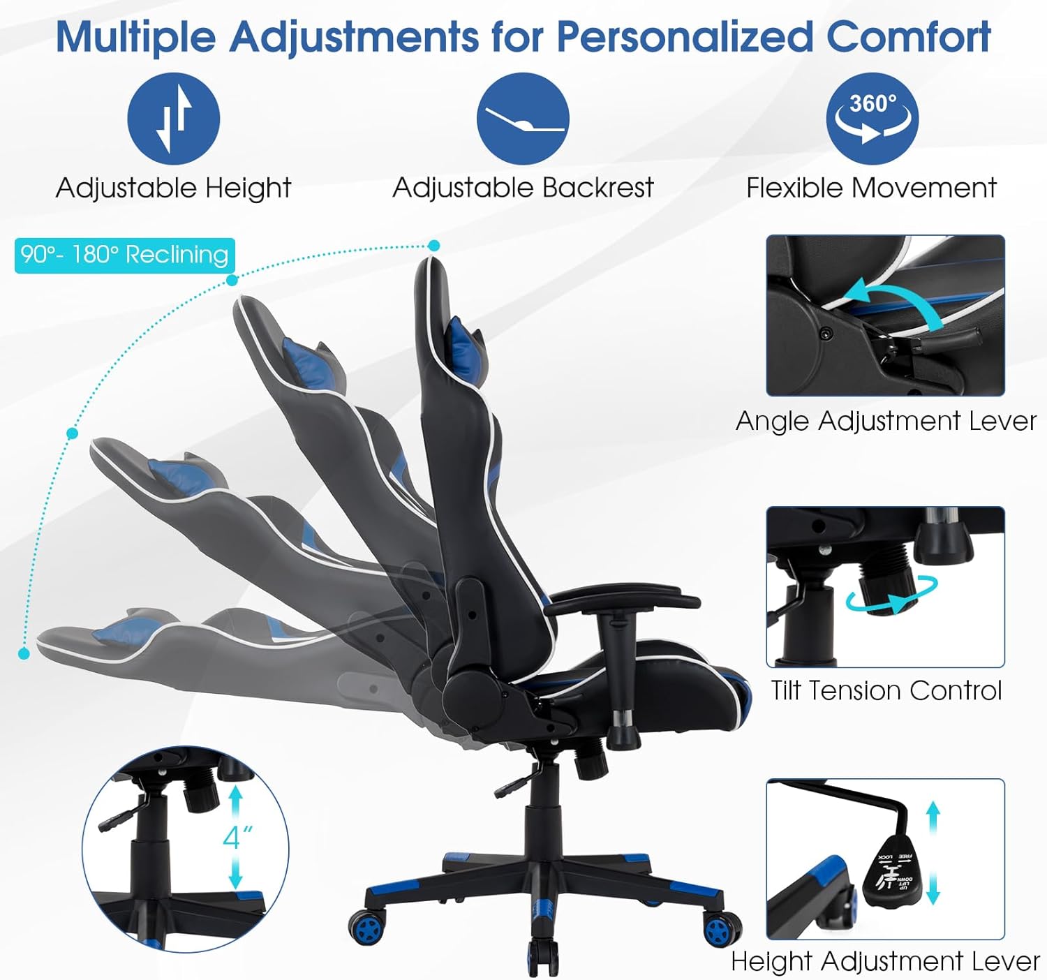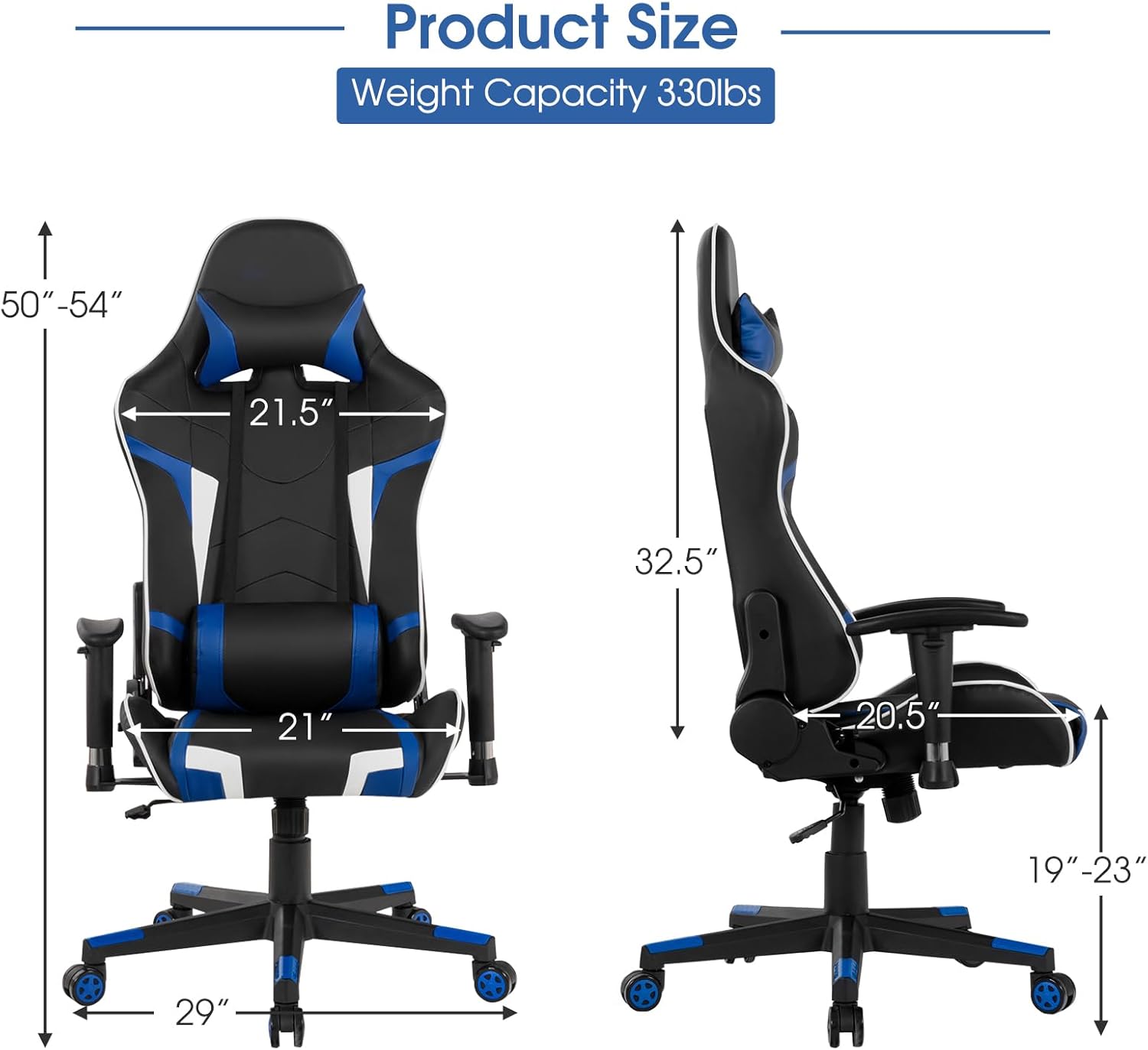 DescriptionOur gaming desk and chair set is designed to provide you with the perfect gaming experience! Crafted of high-quality materials , our office desk and chair set is sturdy and durable for long-term use. The monitor shelf adds more space for the computer monitor and keeps it level with the eyes to relieve cervical and neck pain. With the 47.5'' x 23.5'' desktop, you have a spacious area to keep your game equipment and other supplies. Along with the desk, Our gaming chair offers full-length back support that includes cushioning for the shoulders, head, and neck, ensuring a luxurious level of comfort. Featuring a built-in USB massage lumbar pillow, this chair is designed to alleviate fatigue from extended periods of work. The ergonomic backrest can be tilted from 90 to 180 degrees, catering to your preferences for gaming, working, or napping, while the adjustable armrests provide added support for your arms.FeatureHeavy-duty frame with adjustable foot pad for more stabilityWide gaming surface for holding more itemsSmooth carbon fiber textured desktop is wear-resistantAn extra monitor shelf for holding your monitor wellErgonomic and curved surface for improved comfortCome with a cup holder, headphone hook, gaming handle rack and audio standsReclining backrest allows you playing games, working, studying,napping, etc.USB massage lumbar support helps relieve waist fatigueAdjustable height and armrests suit the height you needHeadrest perfectly support your head and neckWaterproof PU surface makes it easy to cleanSpecificationColor: Black(Desk)+Blue/Grey/Red/White(Chair)Desk Material: MDF, MetalChair Material: Faux Leather, IronDesk Size: 47.5” x 23.5” x 38”(L x W x H)Chair Size: 29”x29”x(50”-54”)(L x W x H)Desk Weight: 48.5 lbsChair Weight: 40 lbsWeight capacity of the desk: 135 lbsWeight capacity of the chair: 330 lbsPackage includes:1 x Gaming Desk1 x Gaming Chair1 x User Guide