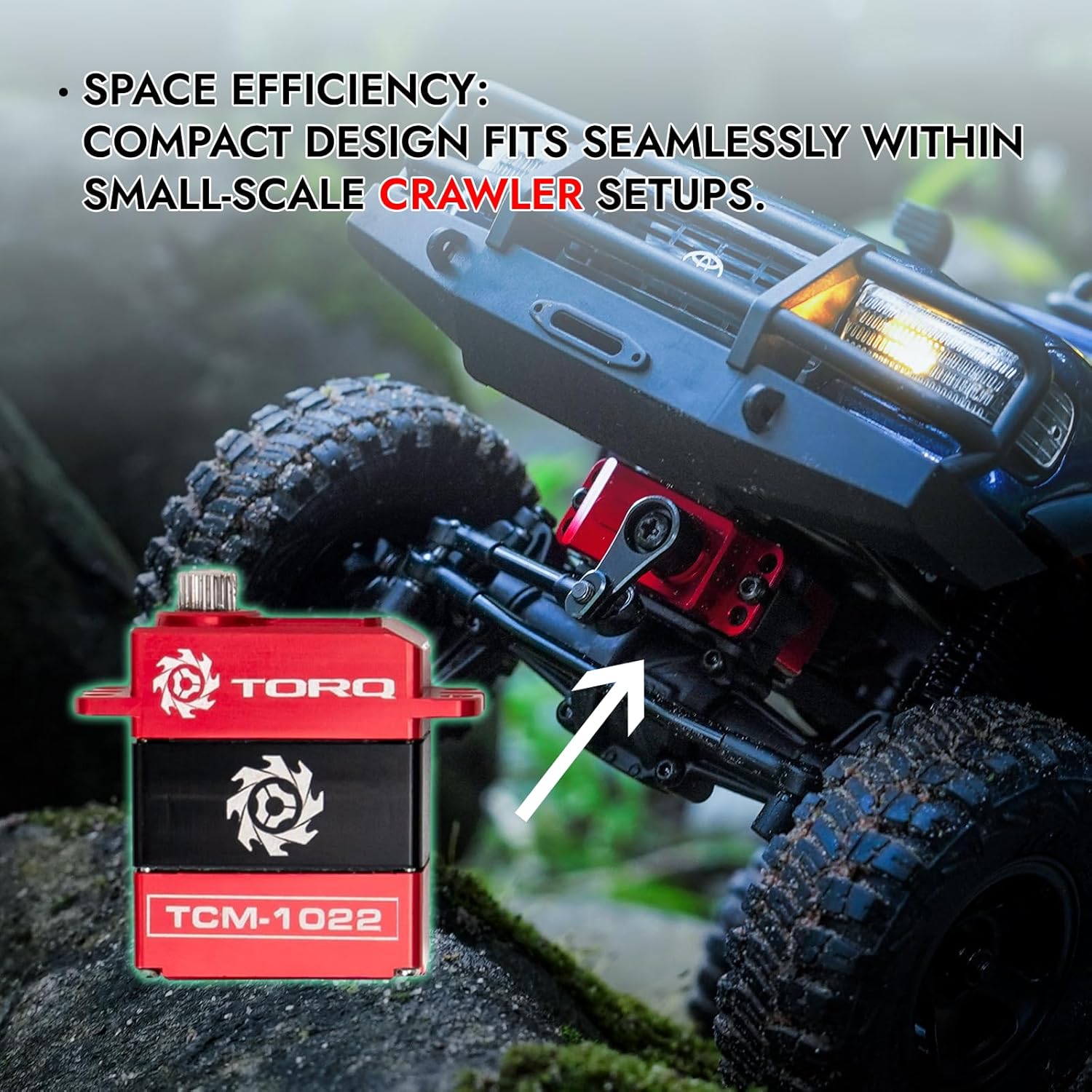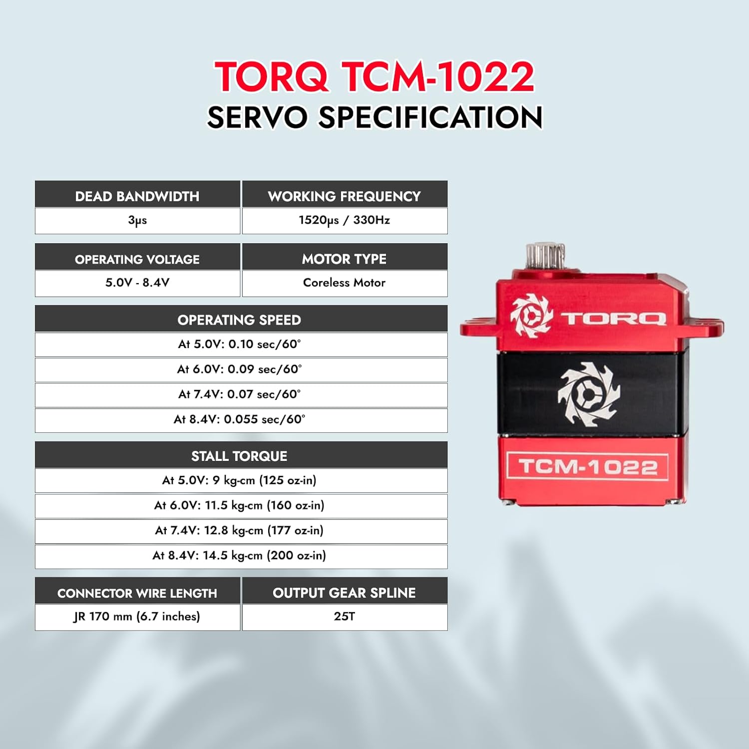 1. Features: - High Torque Output: Delivers powerful performance for small-scale crawlers. - Rear Exit Wires: Ensures suspension travel is unhindered for optimal performance. - Simplified Installation: Easy to mount due to its unique design. - Enhanced Clearance: Designed for ultimate clearance around the servo. 2. Specifications: - Dead Bandwidth: 2μs - Working Frequency: 1520μs / 330Hz - Operating Voltage: 6.0V - 8.4V - Motor Type: Coreless Motor - Operating Speed: - At 6.0V: 0.1 sec/60° - At 8.4V: 0.07 sec/60° - Stall Torque: - At 6.0V: 8.2 kg-cm (113 oz-in) - At 8.4V: 11.5 kg-cm (160 oz-in) - Dimensions: 23 x 12 x 27.5 mm (0.91 x 0.47 x 1.08 inches) - Weight: 20.0 g (0.7 oz) - Connector Wire Length: JR 170 mm (6.7 inches) - Output Gear Spline: 25T 3. TORQ Servo TCM-1022 for TRX-4M & TRX-4MT included: TCM-1022 Full CNC Case Metal Gear Coreless Servo TSP-1001 Servo horn for TRX-4M & TRX-4MT 4. TORQ Servo TCM-1022 for Furitek FX118 Upgrades, FMS included: TCM-1022 Full CNC Case Metal Gear Coreless Servo TSP-1002 Servo extension cable for FX118, CR-18P 2024, FCX24, FCX18, FMT24, CR-18P EVO PRO