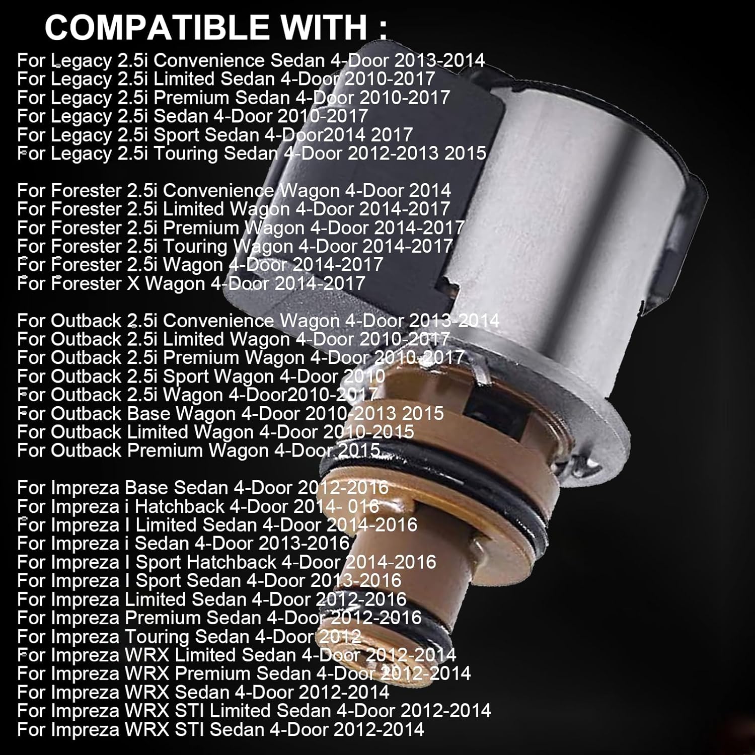 Upgraded Version :Lock-up Solenoid Torque Converter 12.2-13.2 OhmCondition : Brand NewReference Number :TR580 TR690 31825AA050 31825AA05131825AA052 31706AA030, 31706AA030,31706AA031, 31706AA032, 31706AA033Compatible with : Subaru Crosstrek Forester Legacy Outback ImprezaFor Legacy 2.5GT Sedan 2010-2012For Legacy 2.5i Convenience Sedan 2013-2014For Legacy 2.5i Limited Sedan 2010-2017For Legacy 2.5i Premium Sedan 2010-2017For Legacy 2.5i Sedan 2010-2017For Legacy 2.5i Sport Sedan 2014 2017For Legacy 2.5i Touring Sedan 2012-2013 2015For Forester 2.5i Convenience Wagon 4-Door 2014For Forester 2.5i Limited Wagon 4-Door 2014-2017For Forester 2.5i Premium Wagon 4-Door 2014-2017For Forester 2.5i Touring Wagon 4-Door 2014-2017For Forester 2.5i Wagon 4-Door 2014-2017For Forester X Wagon 4-Door 2014-2017For Outback 2.5i Convenience Wagon 4-Door 2013-2014For Outback 2.5i Limited Wagon 4-Door 2010-2017For Outback 2.5i Premium Wagon 4-Door 2010-2017For Outback 2.5i Sport Wagon 4-Door 2010For Outback 2.5i Wagon 4-Door2010-2017For Outback Base Wagon 4-Door 2010-2013 2015For Outback Limited Wagon 4-Door 2010-2015For Outback Premium Wagon 4-Door 2015For Impreza Base Sedan 4-Door 2012-2016For Impreza i Hatchback 4-Door 2014- 016For Impreza I Limited Sedan 4-Door 2014-2016For Impreza i Sedan 4-Door 2013-2016For Impreza I Sport Hatchback 4-Door 2014-2016For Impreza I Sport Sedan 4-Door 2013-2016For Impreza Limited Sedan 4-Door 2012-2016For Impreza Premium Sedan 4-Door 2012-2016For Impreza Touring Sedan 4-Door 2012For Impreza WRX Limited Sedan 4-Door 2012-2014For Impreza WRX Premium Sedan 4-Door 2012-2014For Impreza WRX Sedan 4-Door 2012-2014For Impreza WRX STI Limited Sedan 4-Door 2012-2014For Impreza WRX STI Sedan 4-Door 2012-2014Package Include:1x Torque Converter Lock Up SolenoidNote :Please check that the accessory number matches your needs before purchasing. If you do not have an installation manual and are not skilled enough to install this accessory, it is recommended that you seek assistance from a qualified mechanic.Made of heavy-duty materials that are impact-resistant, corrosion-resistant and resistant to deformation. Stable characteristics, high reliability.Use the product to replace the original old products, so that your vehicle brand new. This would be an ideal replacement for your vehicle.Note :Please Check The Part Number Before Buying To Make Sure It Fits Your.Can Be Easily Adjusted, Easily Installed And Easily Removed With A Single Assembly.The Installation Method Can Contact The Seller By Mail, We Will Be Happy To Help You, You Can Also Check The Installation Method On YTube.